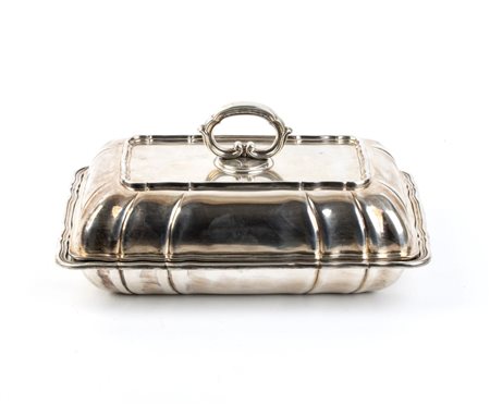 di forma rettangolare con costolature verticali e presa removibile. Argento 800/1000, punzonata "800" e argentiere non identificato.