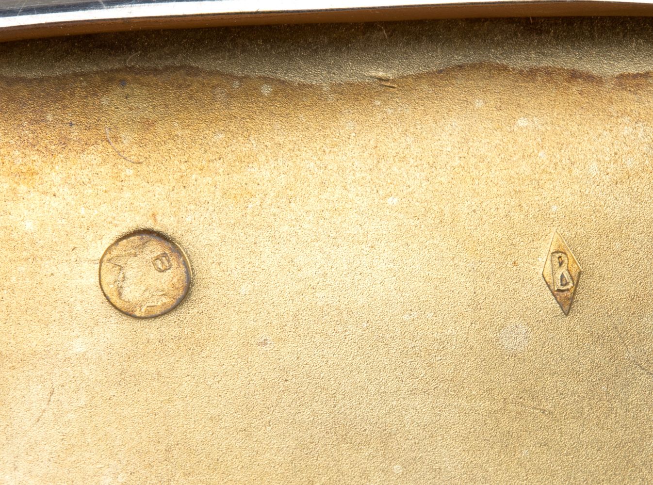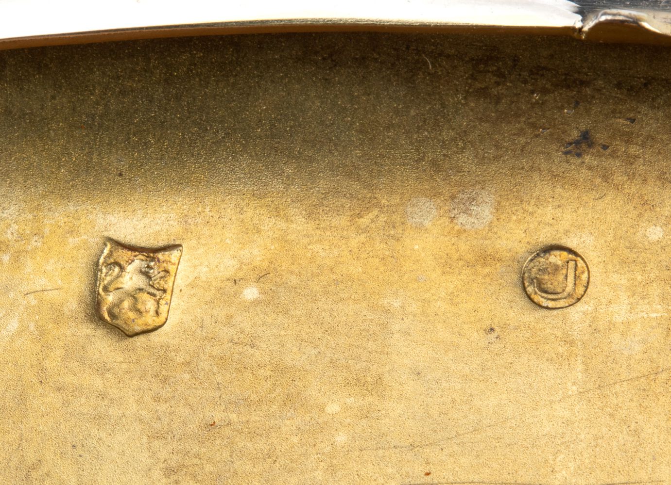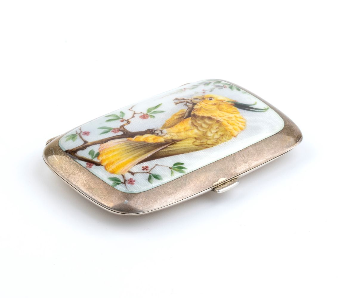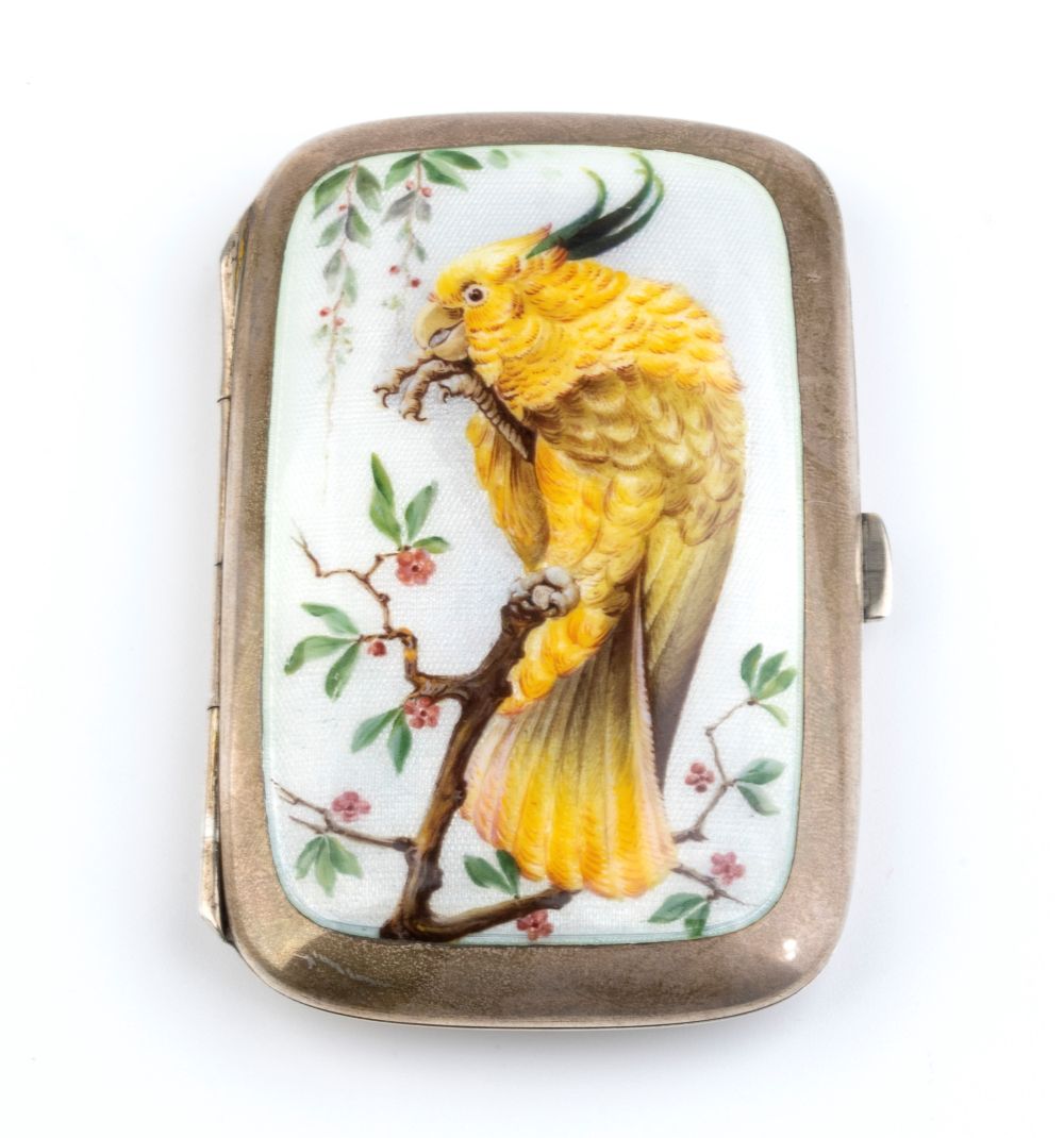 di forma rettangolare con coperchio incernierato decorato con smalti policromi con la raffigurazione di un pappagallo cacatua posto sul ramo di un albero. Argento 934/1000, punzonato con i marchi in uso nei Paesi Bassi dal 1814 al 1953 e con la lettera dataria del 1919.
