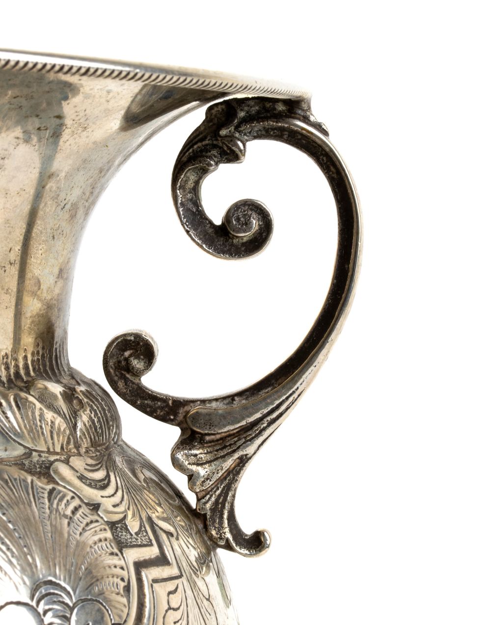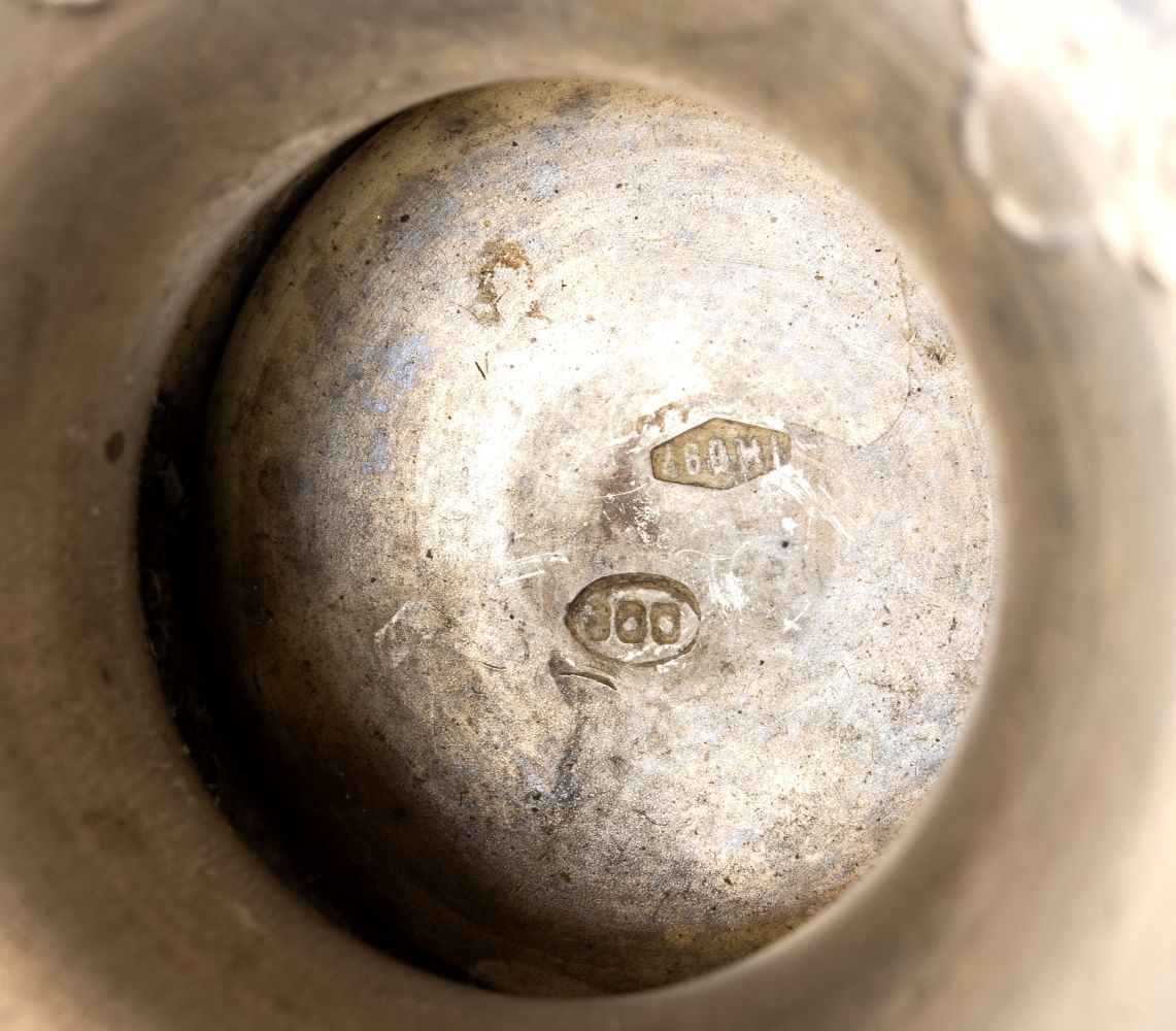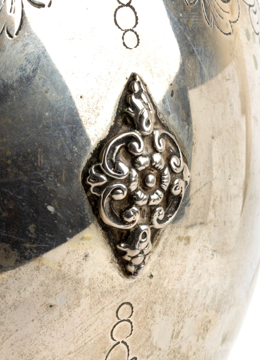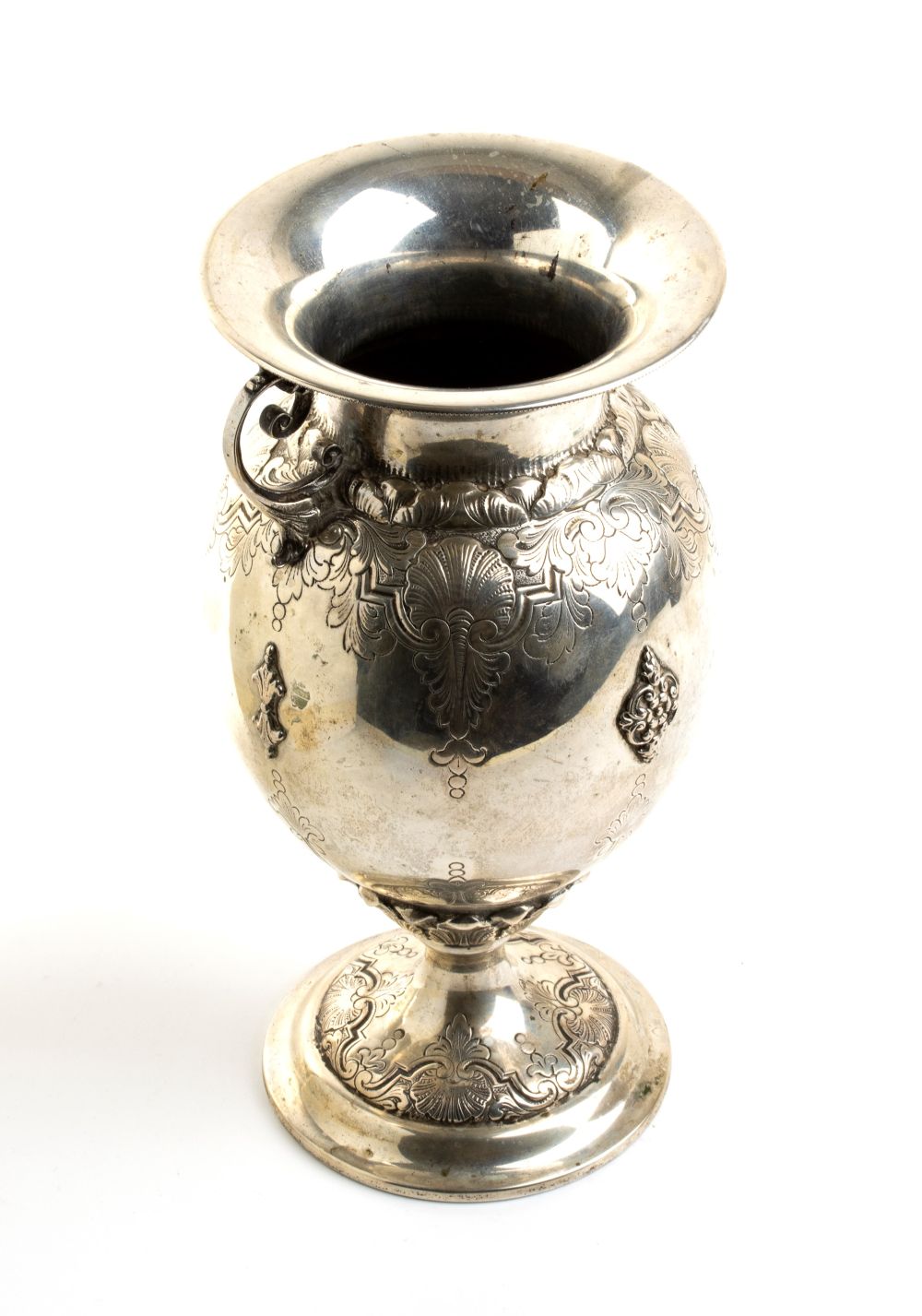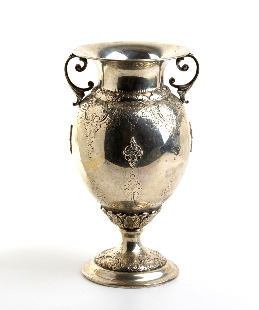 corpo piriforme a decori vegetali, biansato, poggiante su piede circolare. Argento 800/1000, punzonato "800 - 460 MI", argentiere Carlo Lombardi.