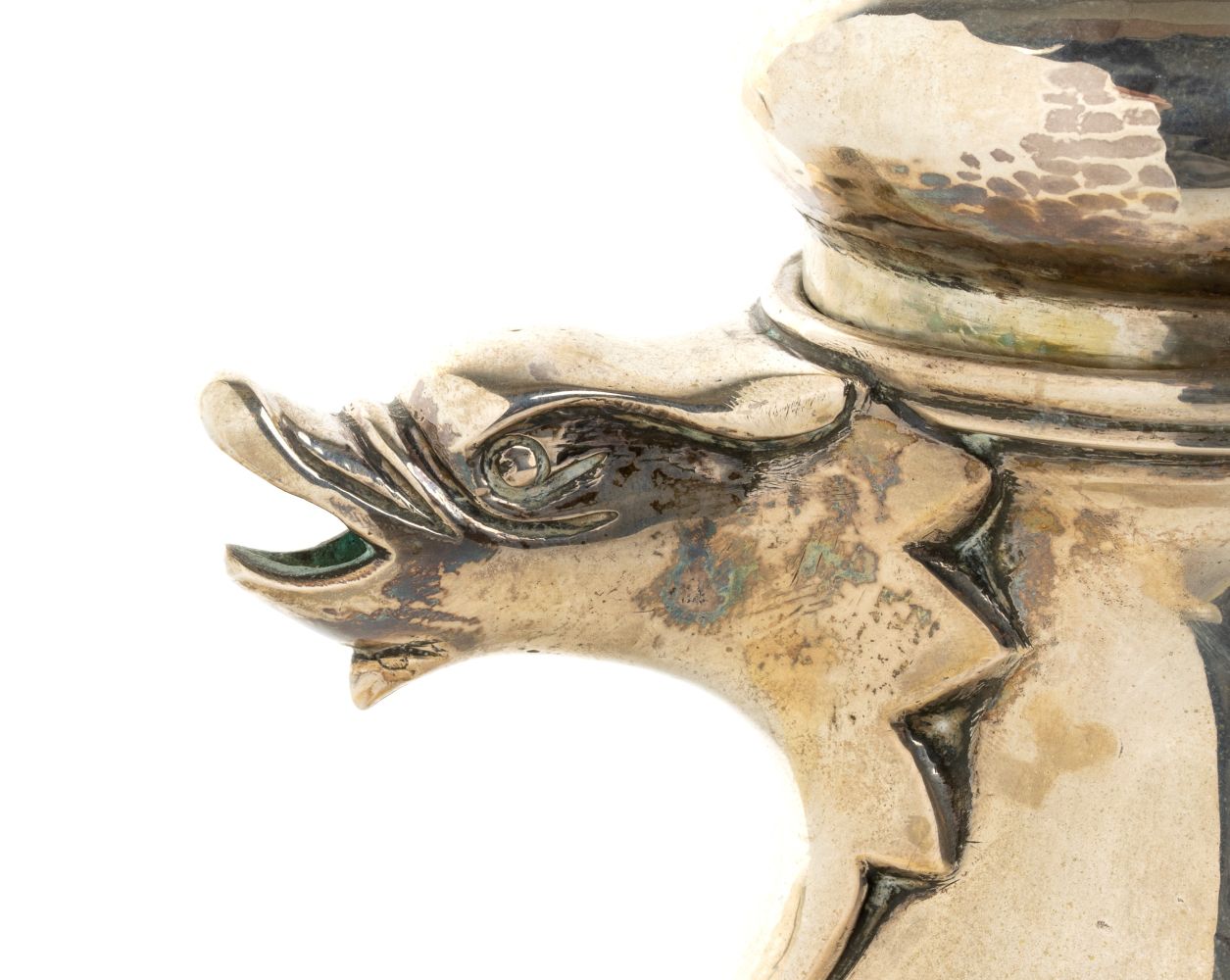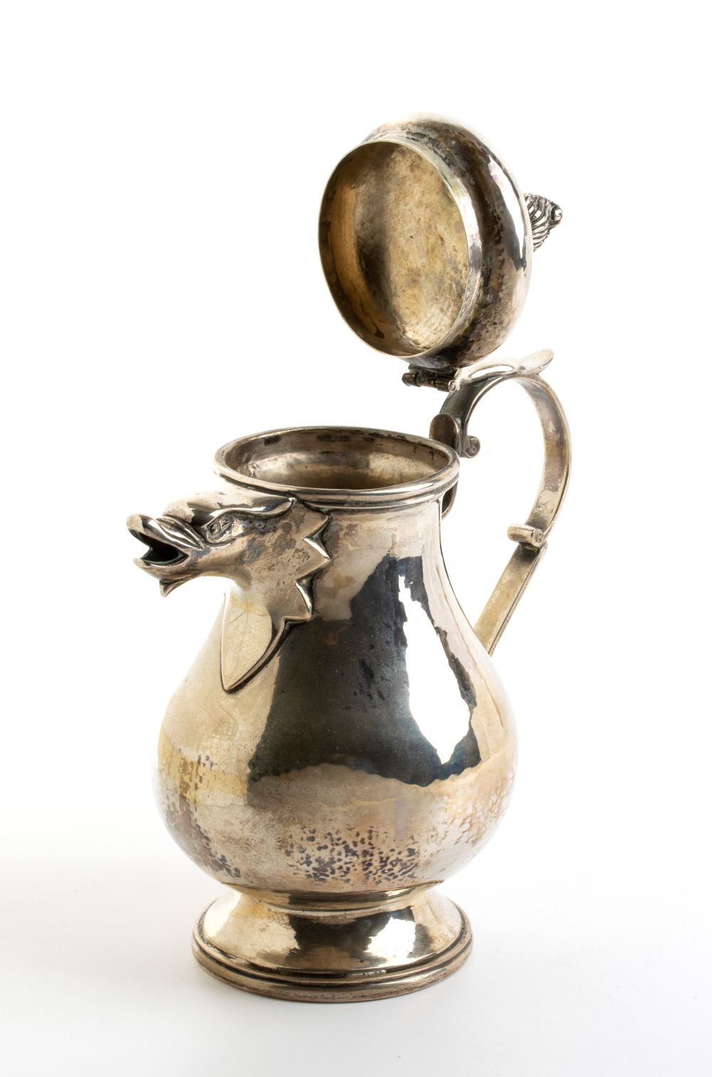 corpo piriforme su base circolare con versatoio a forma di testa di rapace. Apparentemente non punzonata ma testata con acido e pietra di paragone è garantito per essere argento.