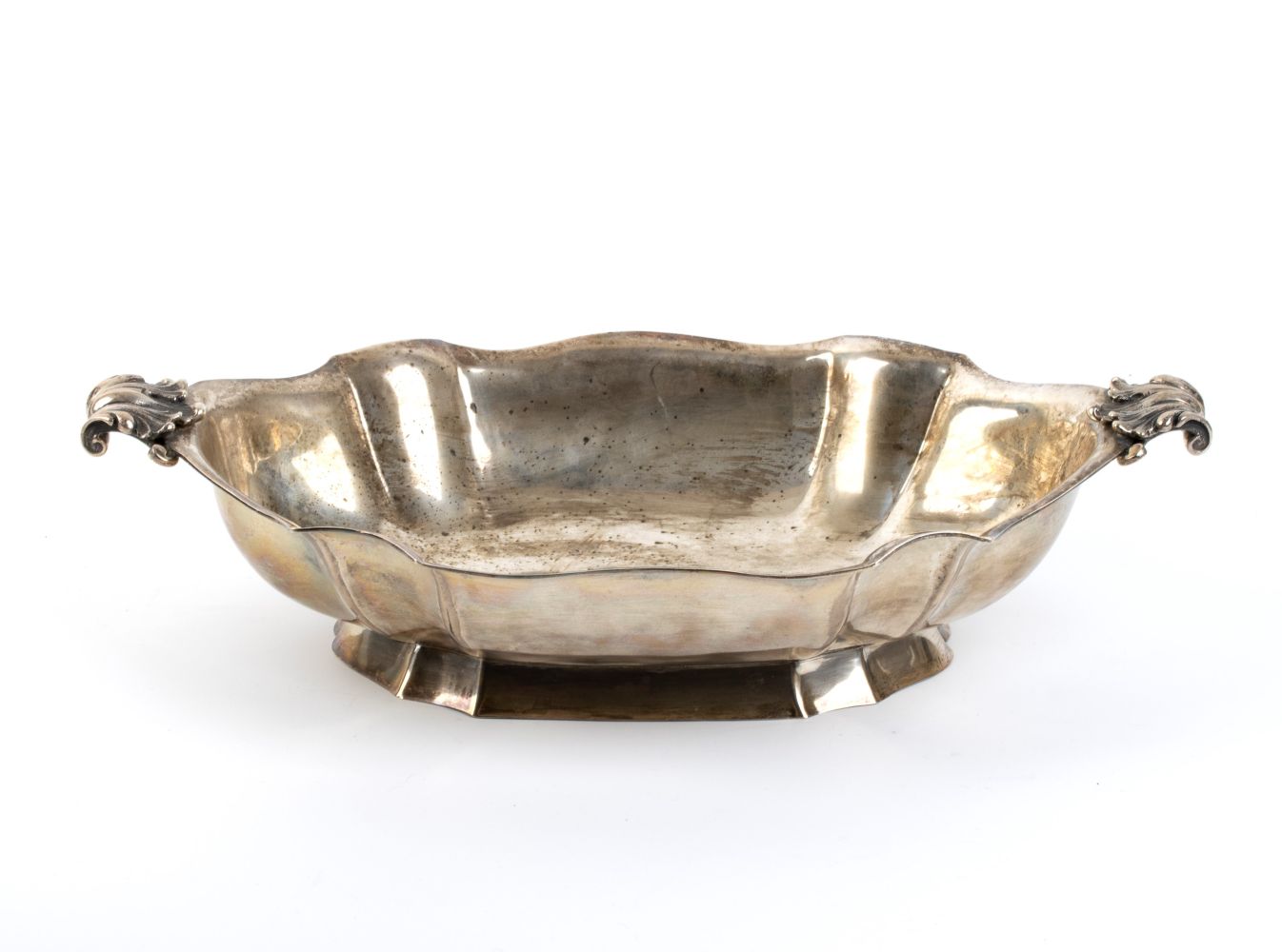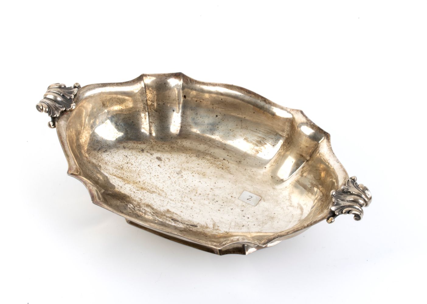 di forma ovale sagomata con prese vegetali laterali. Argento 800/1000, punzonato "800 - 32 marchio del fascio MI", argentiere DITTA MESSULAM ENRICO di Alberto.