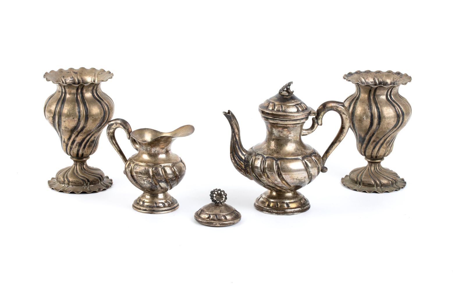 composto da una piccola caffettiera, una lattiera e due vasi a trombino. Argento 800/1000, punzonati "800".