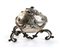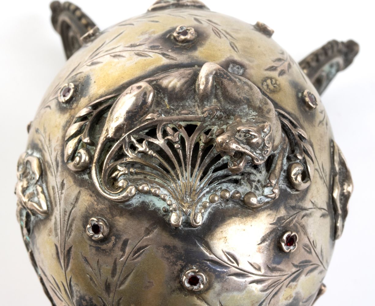 in argento fuso con coperchio ad innesto, decorato con festonii vegetali ed un felino, poggiante su un supporto a tripode con volute vegetali.