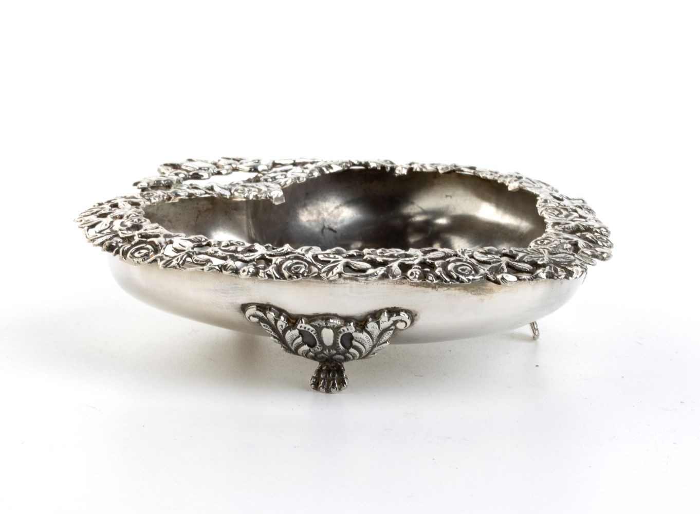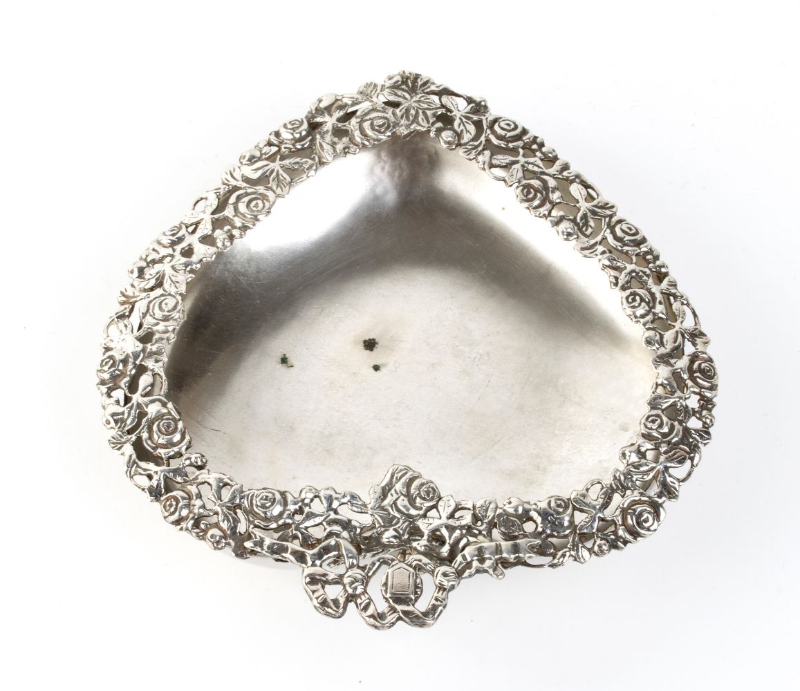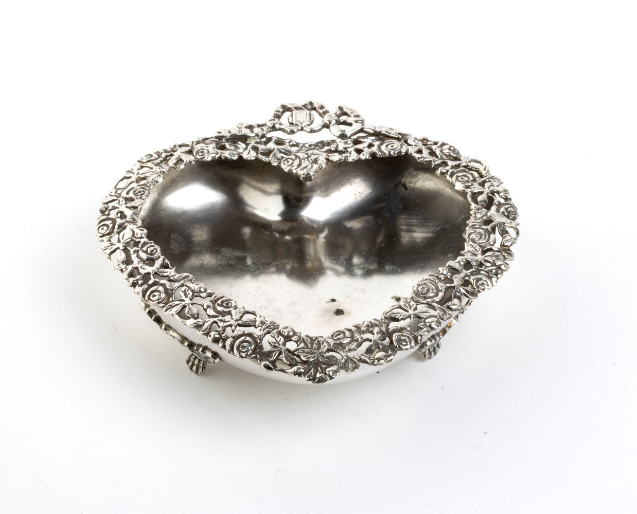 a forma di cuore poggiante su tre piedi. Argento 800/1000, punzonato " 283 FI - BR - 800", argentiere Brandimarte