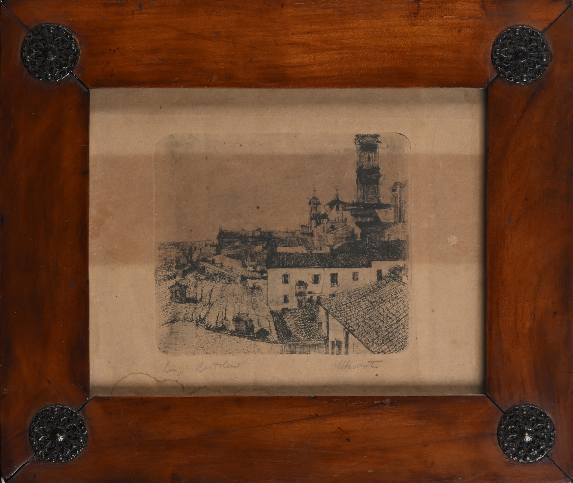 Luigi Bartolini Cupramontana 1892-Roma 1963 Macerata 1921 Acquaforte Firma e titolo a matita "Luigi Bartolini, Macerata". Monogramma e data in lastra "B. 1921" cm 10,5x12,2 - con cornice cm 23,5x27,5