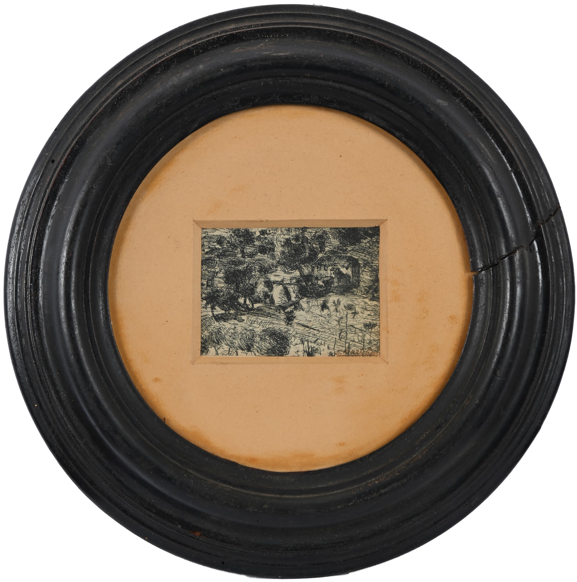 Luigi Bartolini Cupramontana 1892-Roma 1963 Paesaggio con casolari Acquaforte Firma in basso a destra "L. Bartolini".  cm 6x8,6 - con cornice diametro cm 26