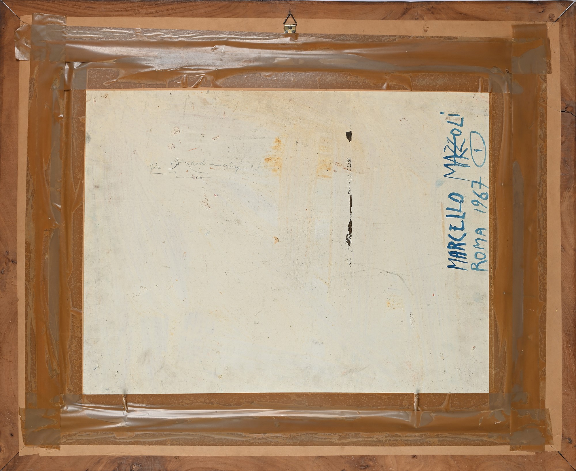 Marcello Mazzoli Senza titolo 1967 Olio su tavola Firma e data in basso a destra "Marcello Mazzoli, Roma, 1967". Al verso reca firma e data cm 45x61 - in cornice cm 65,5x82