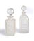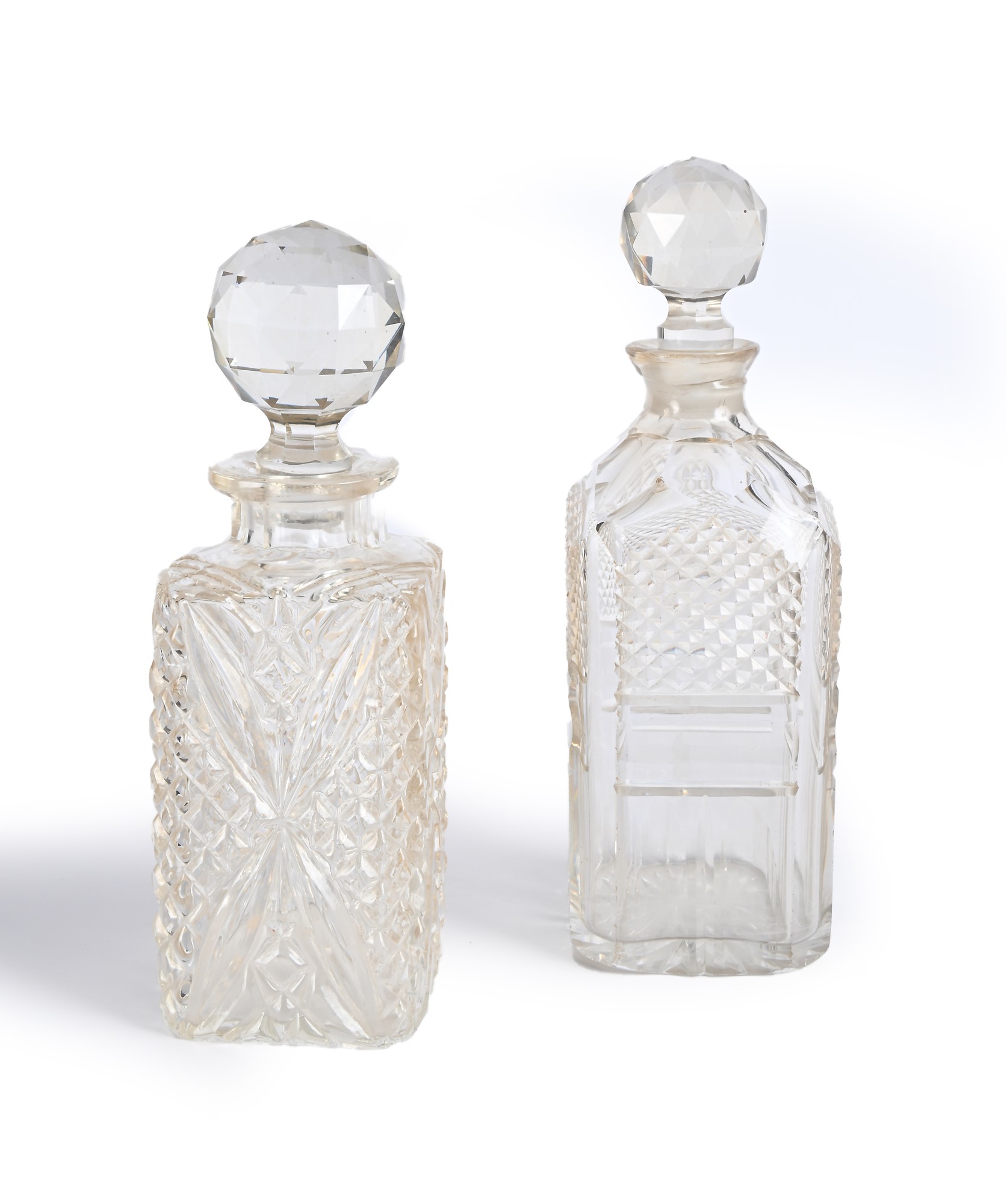 Due bottiglie da liquore diverse in cristallo forma squadrata e tappi sfaccettati altezza cm 25 e cm 27