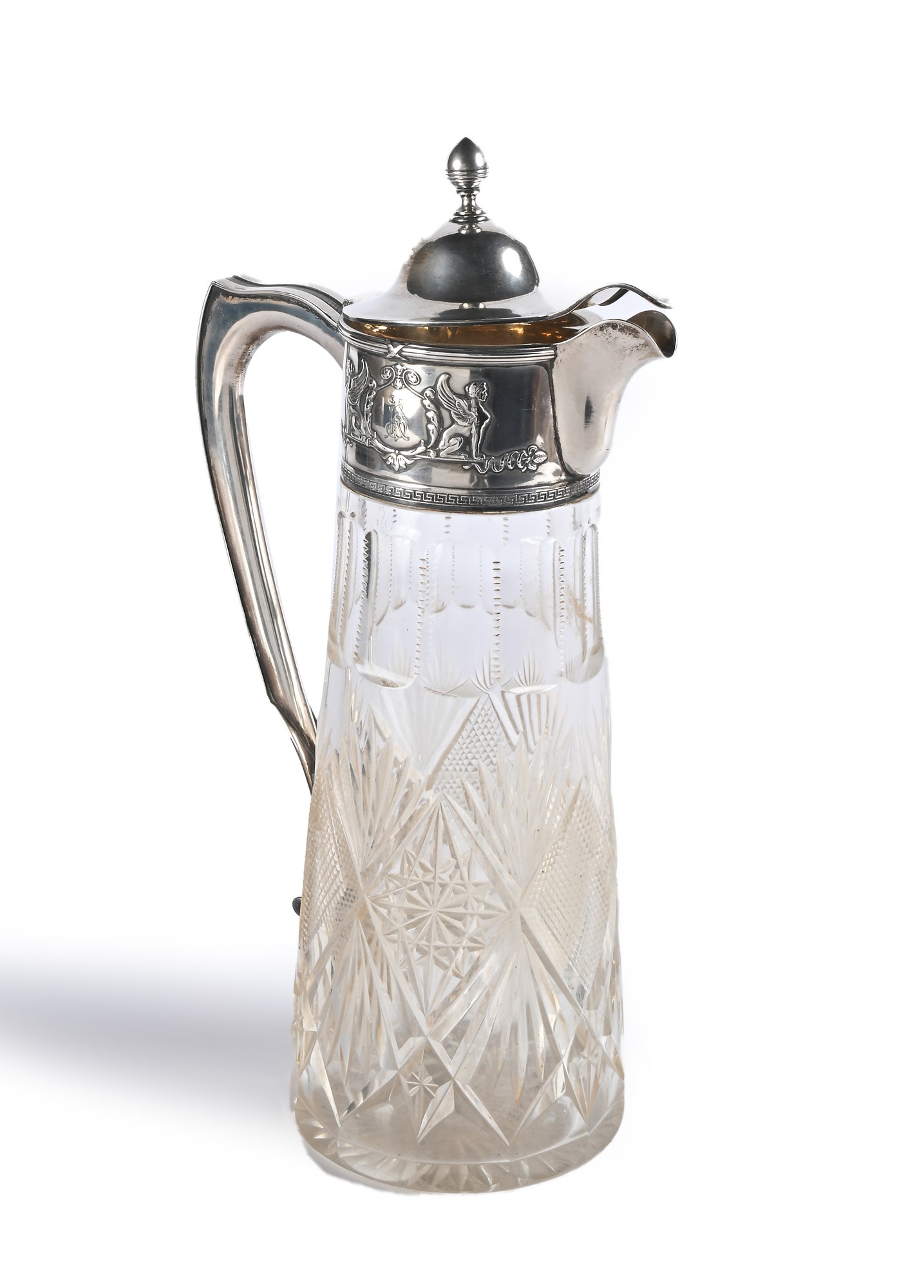 Caraffa in cristallo montata in argento, Russia profilo superiore rivestito in argento decorato da medaglione con iniziali R.I. incise, affiancato da sfingi