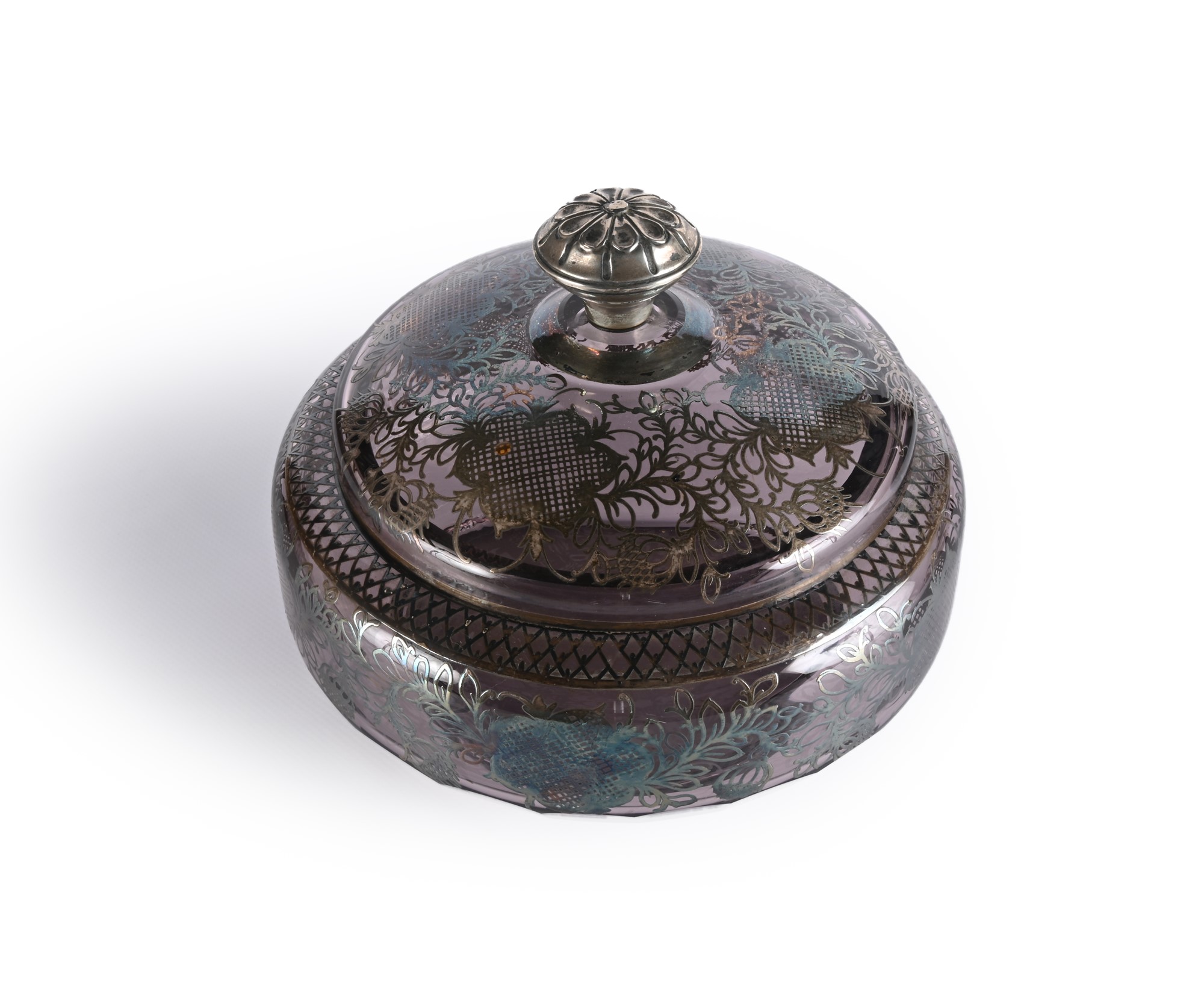 Coppa con coperchio in vetro ametista con decorazione in argento, Anni Trenta...