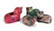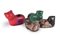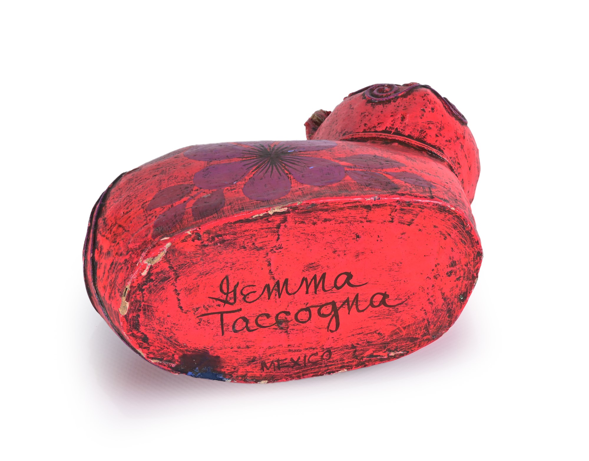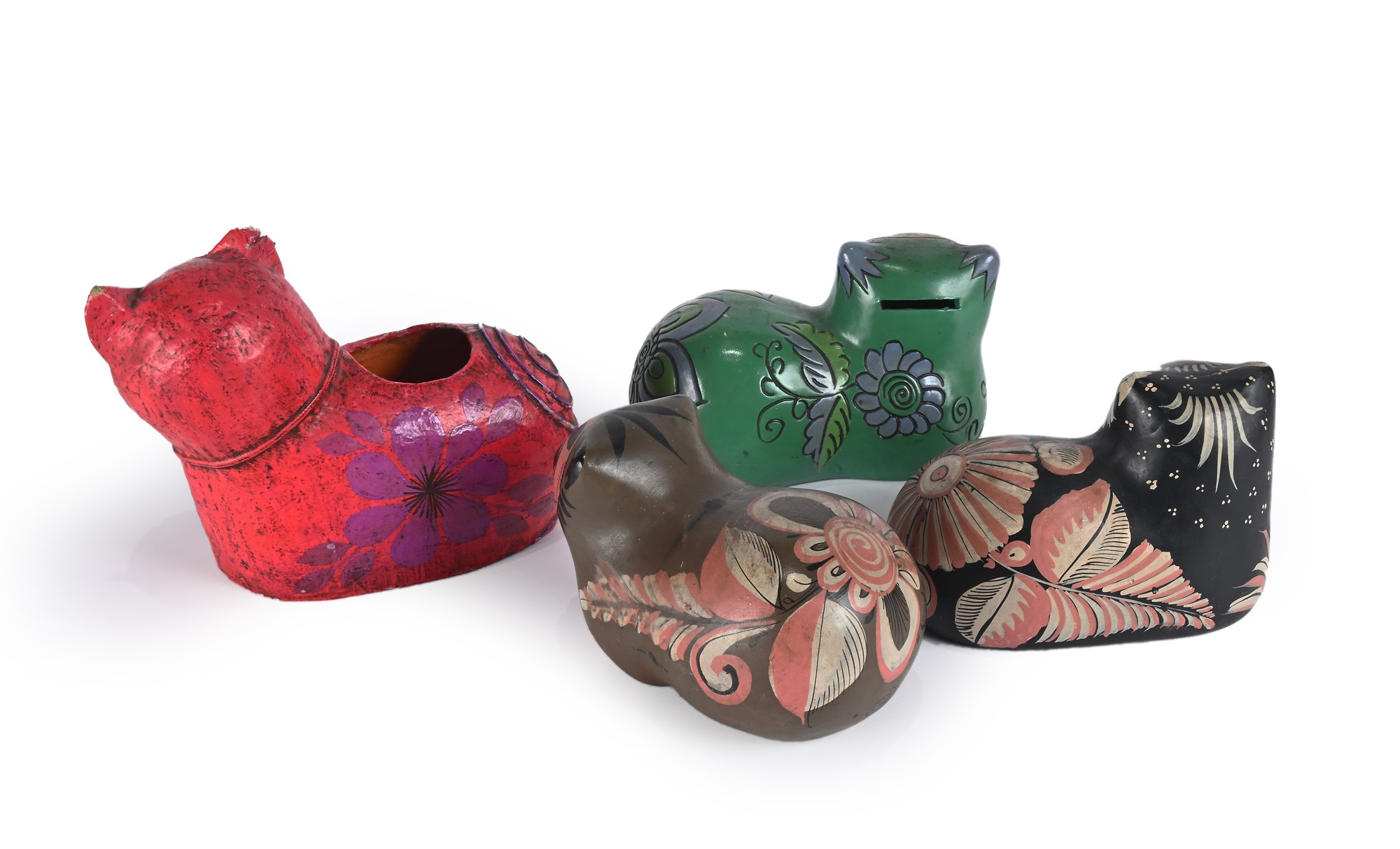 Quattro diverse figure di gatto, arte popolare messicana terracotta, gesso e cartapesta nero, marrone, verde caratterizzato da feritoia salvadanaio e in cartapesta rossa come portavaso a firma di Jemma Taccogna, artista italiana nata in provincia di Bari nel 1923 e trasferitasi in Messico nel 1954 quando era già una scultrice conosciuta a New York, aprì uno studio per la realizzazione di opere in cartapesta con sessanta dipendenti, denominato Artes Gemma, dando una spinta all'industria della cartapesta in Messico cm 9x15x8,5 e cm 13x18x8,5