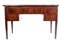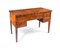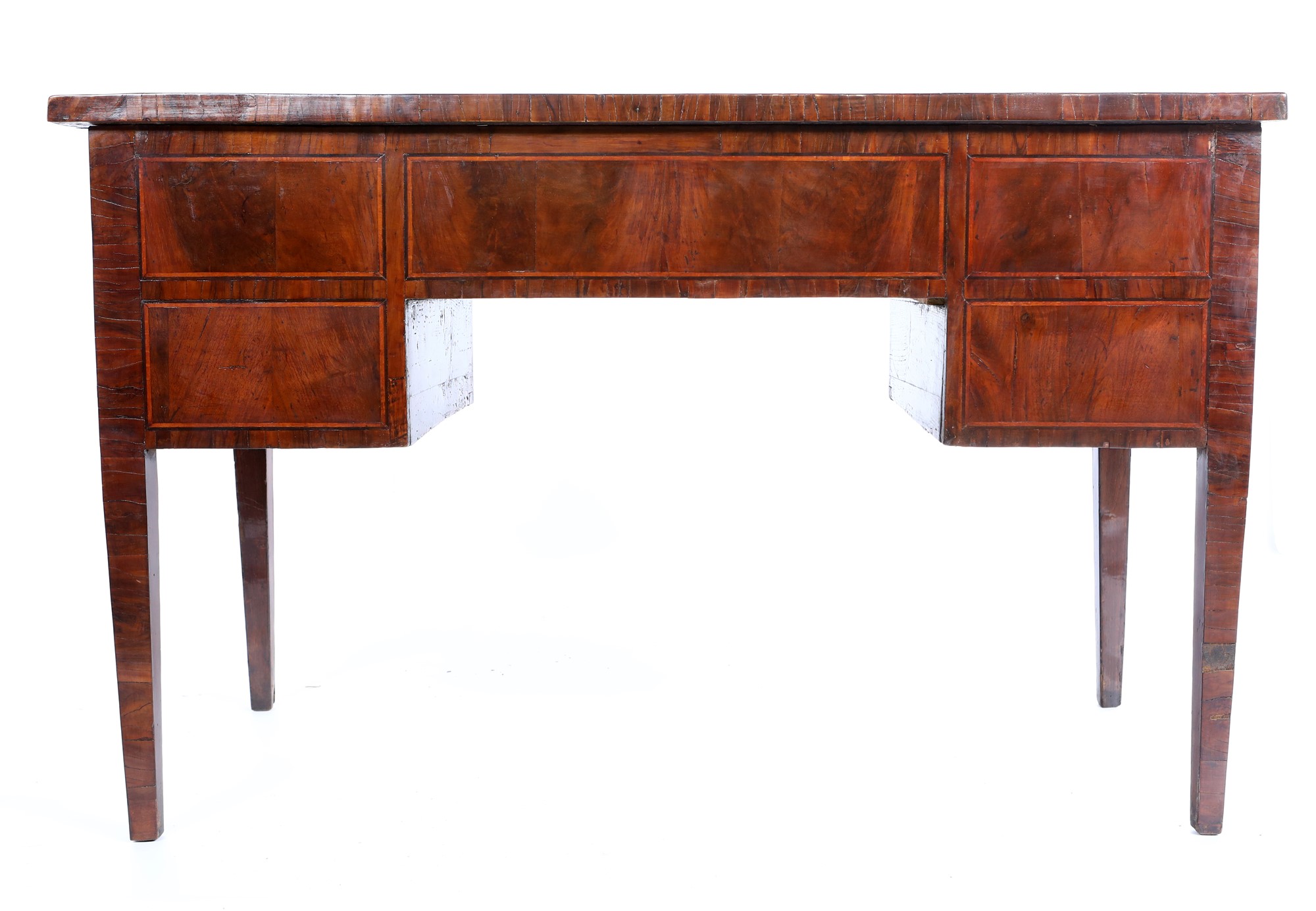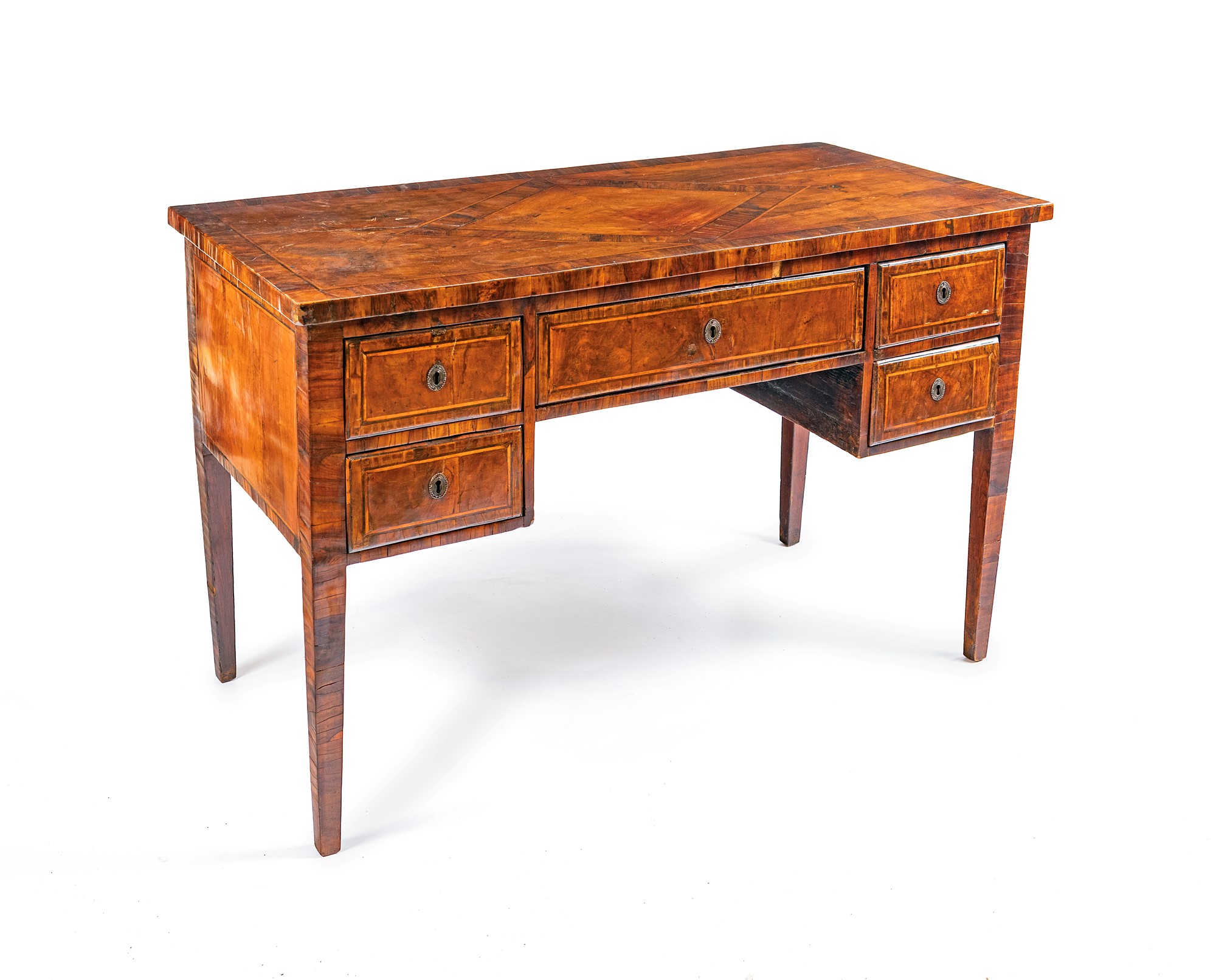 Scrivania da centro in mogano, Italia centrale, fine XVIII/inizi XIX secolo con due ordini di filettature intarsiate in legni di frutto naturali e tinti posti a cornice della varie partizioni; piano rettangolare, un cassetto al centro della fascia affiancato da due in colonna simmetricamente disposti ai lati, gambe rastremate
