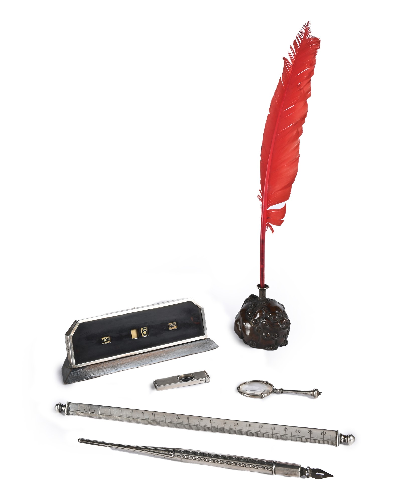Sei oggetti da scrivania in argento e metallo argentato calendario giornaliero (cm 5x17x4); righello (cm 26); pennino (cm 20); piccola lente d'ingrandimento (cm 7,5x3,3); apri busta (cm 5) e calamaio zoomorfo in pietra dura (cm 6,5) con piuma misure diverse