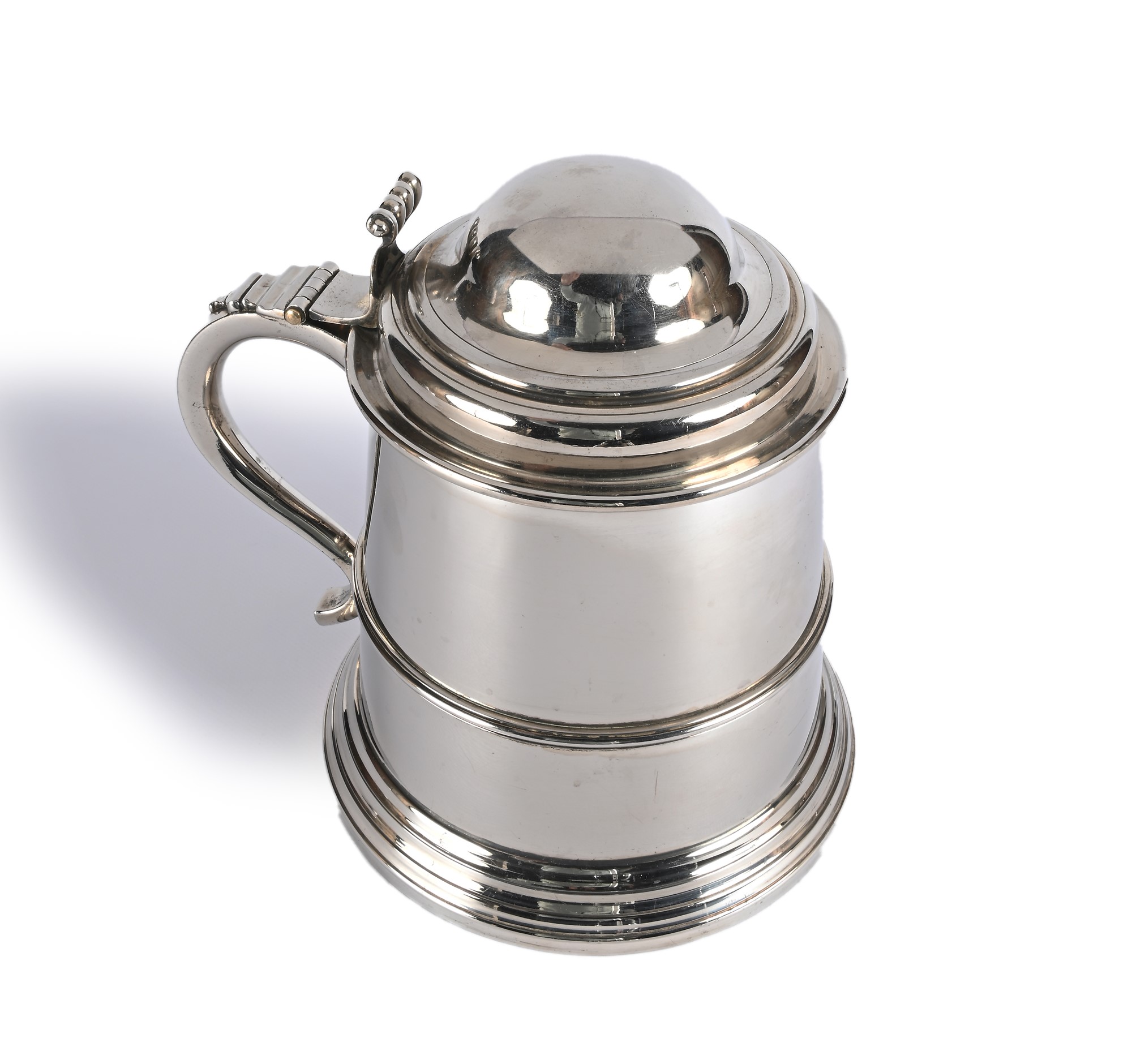 Grande tankard portaghiaccio in metallo argentato caratteristica forma cilindrica con coperchio a cupolino incernierato e manico sagomato cm 23x26x20