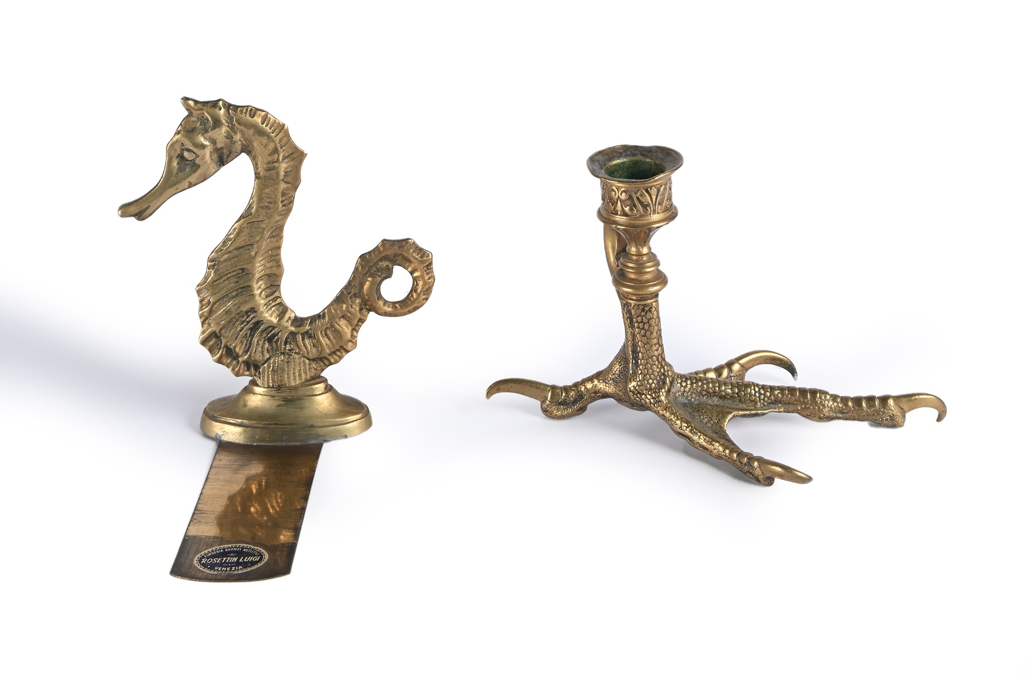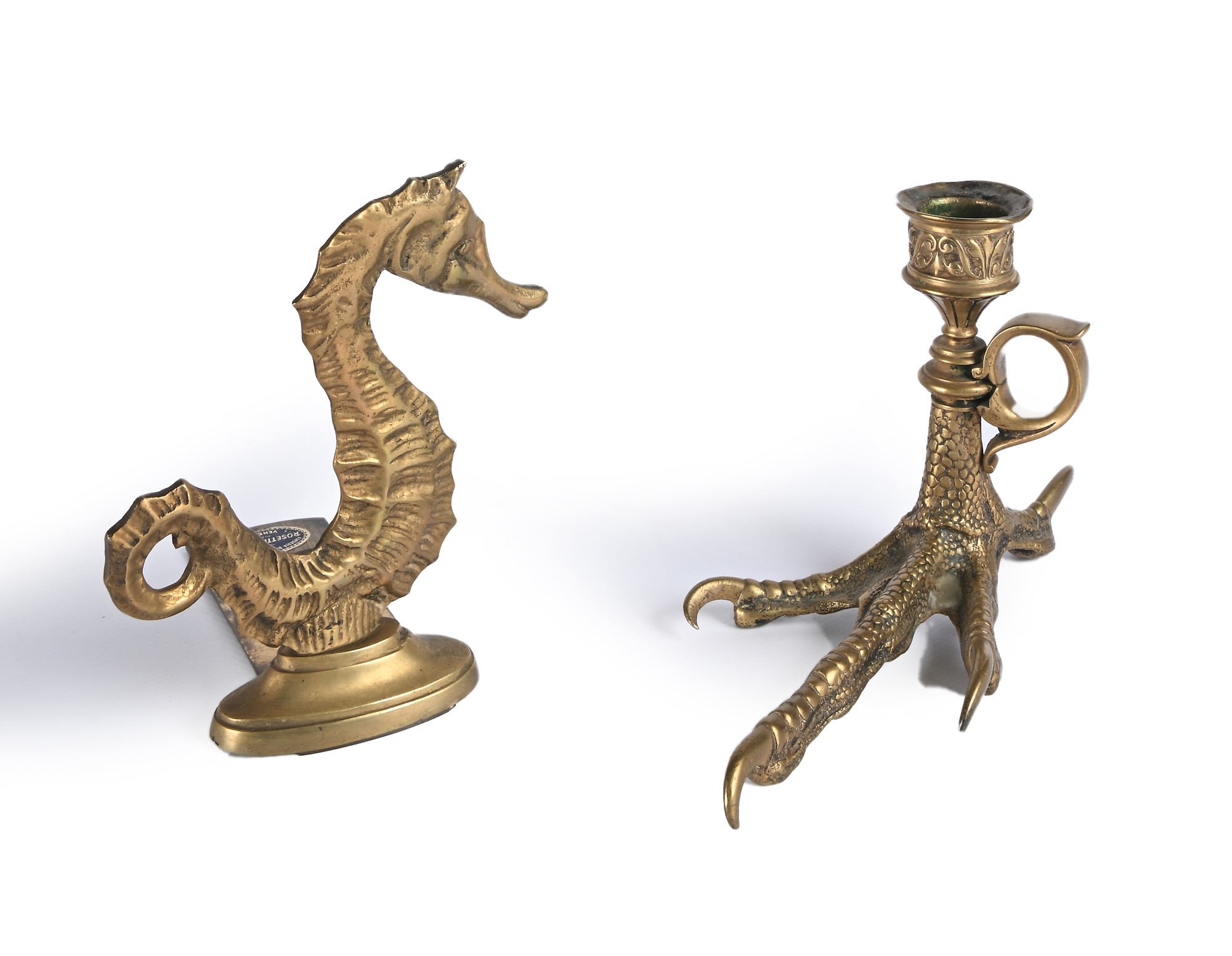 Lot 414 | Fermaporta in ottone a forma di ippocampo e bugia ad artiglio cm 15x13x13 e...