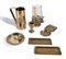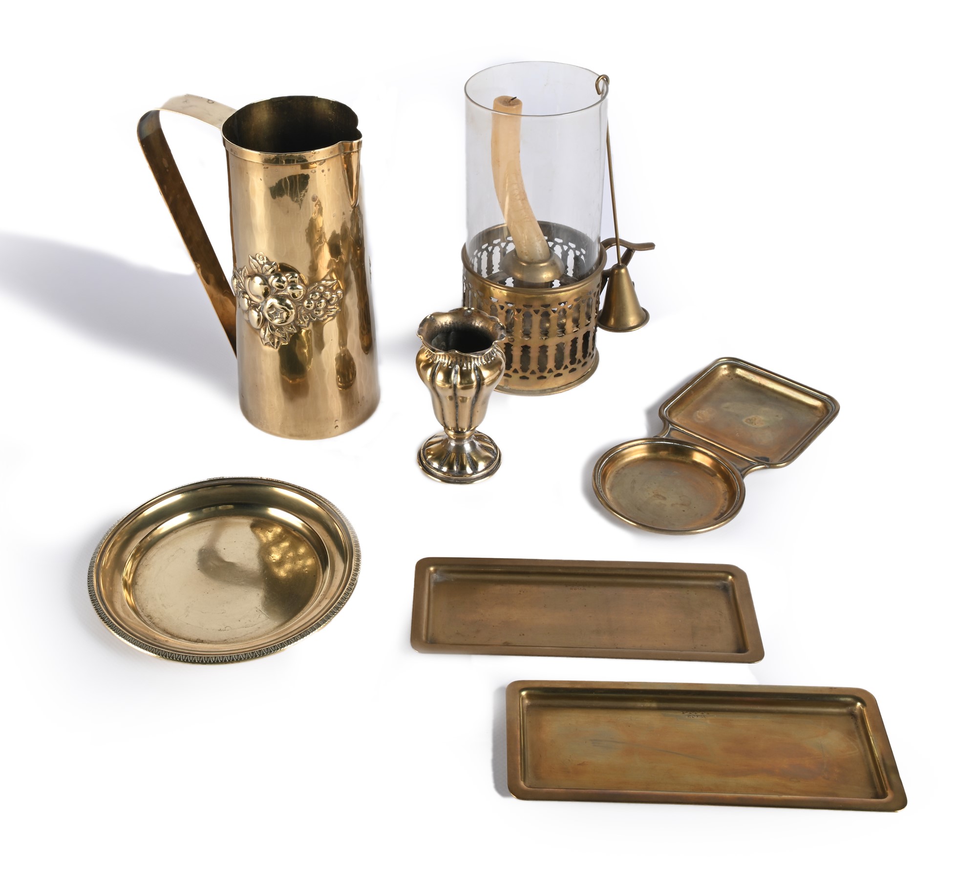 Sette oggetti in ottone piatto (cm 15,5), due vassoietti rettangolari marcati Pitti (cm 18,5x7,5); vassoietto a due scomparti di diversa forma (cm 19x9); vasetto (cm 10); versatoio cilindrico con frutta sbalzata (altezza cm 20); bugia con parafiamma in vetro e campanella spegni candela (altezza complessiva cm 20) misure diverse