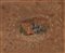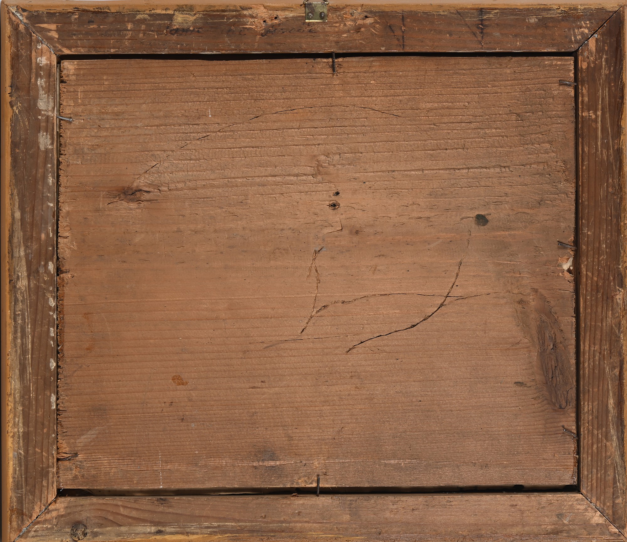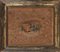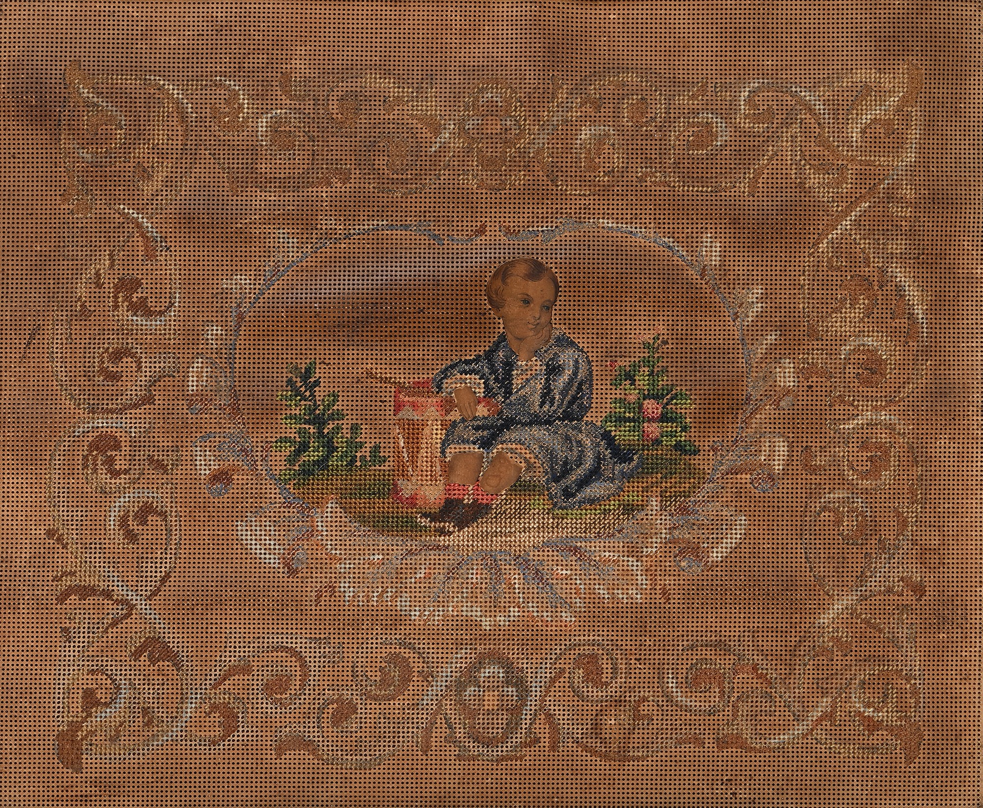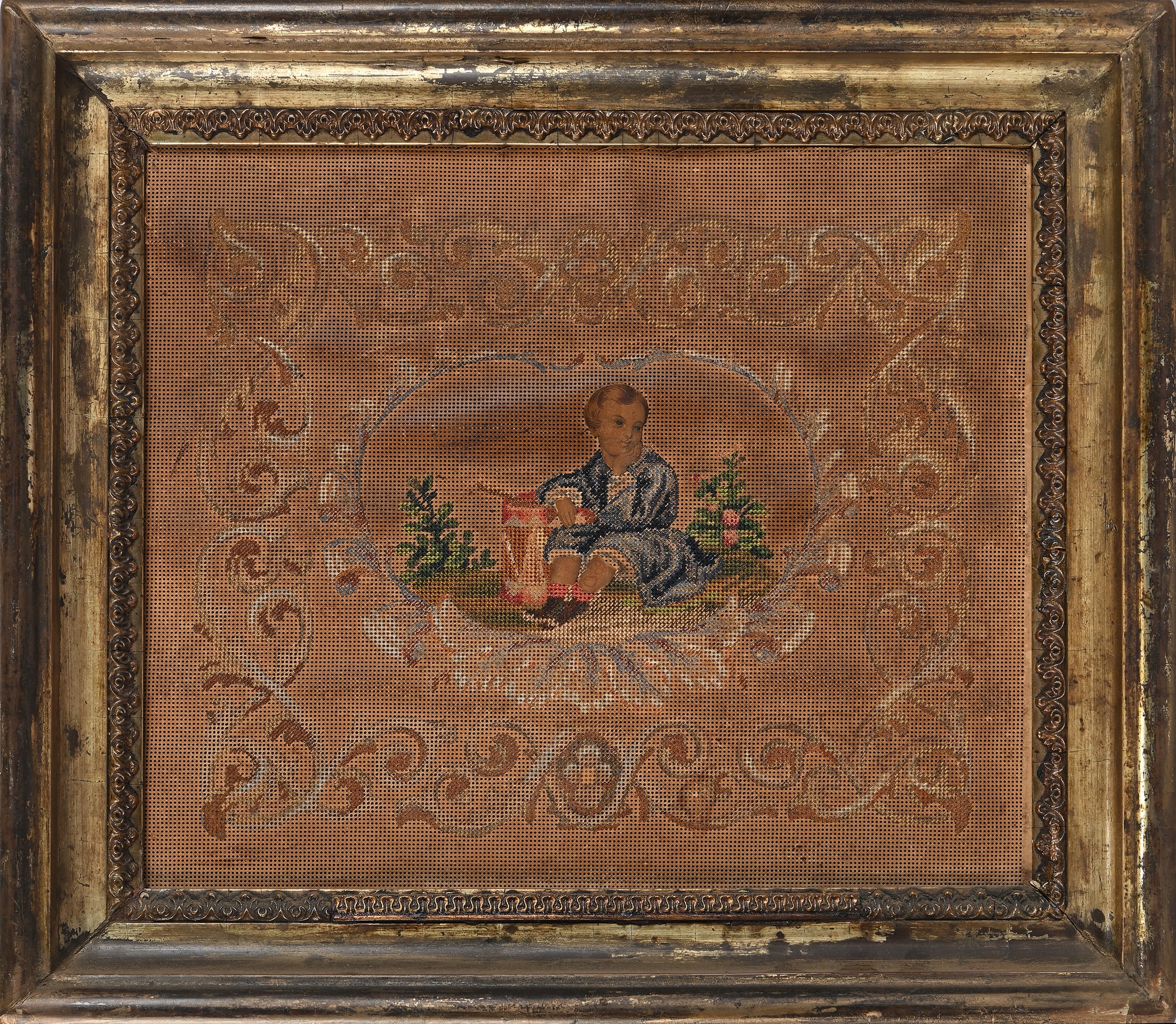 Ricamo incompiuto e découpage, fine del XIX secolo eseguito a mezzo punto su antico canovaccio, raffigurante un bambino con tamburo seduto su zolla erbosa delimitata da cespugli fioriti, racchiuso in una ghirlanda inclusa in un'ampia bordura abbozzata costituita da volute vegetali. Cornice modanata in legno dorato. cm 23x27 - con cornice cm 31x36