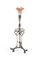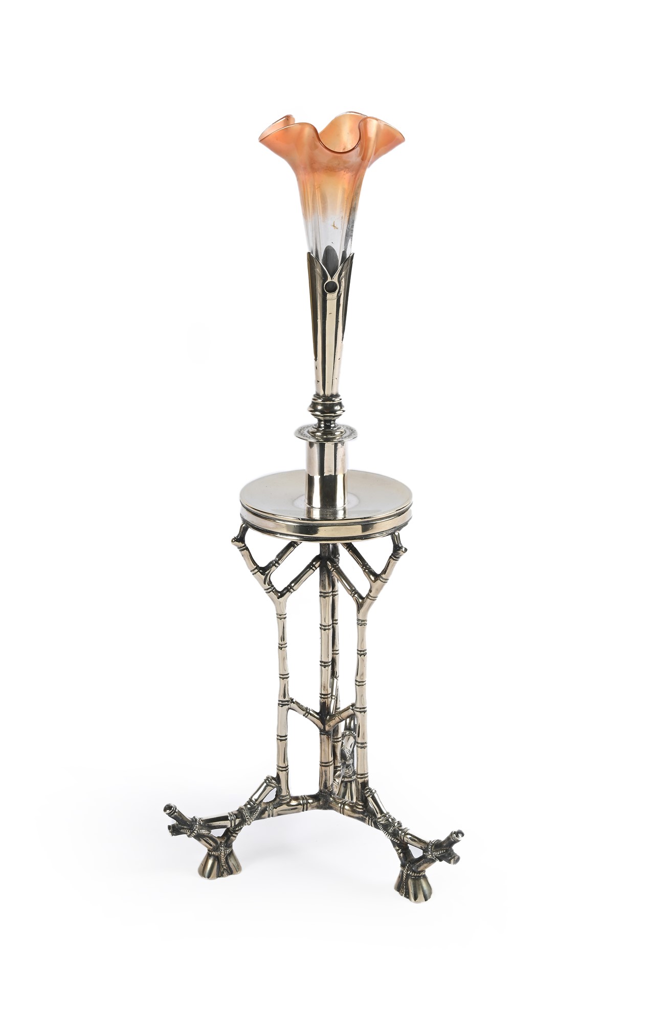 Portafiori in metallo argentato, primi del Novecento struttura imitante il bambù e campanula in vetro iridato sfumato nei toni dell'arancio altezza cm 41