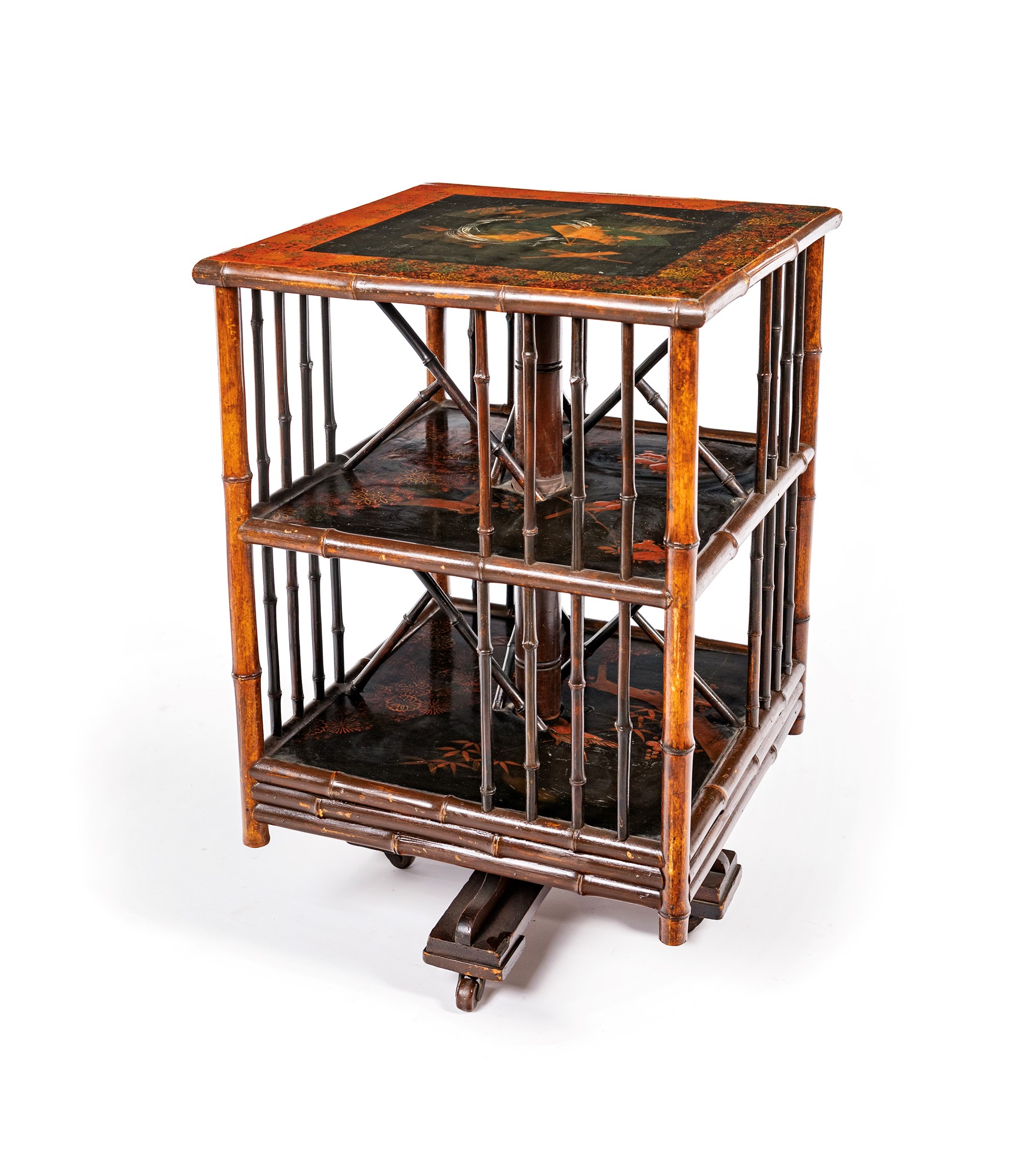 Libreria girevole in bambù e lacca, nei modi della Maison Pierret & Vibert, Francia, fine del XIX secolo caratteristica struttura squadrata a tre piani parzialmente chiusi da canne di bambù, decorati ognuno da composizioni di gusto orientale; il piano superiore, racchiuso su due lati da un'ampia bordura con fitta decorazione a fiori su fondo nero ed analoga composizione su fondo rosso diametralmente opposta sugli altri due lati, reca al centro una disposizione di ventagli di gusto "japonisme"; base a crociera su ruote. Lievi difetti al piano