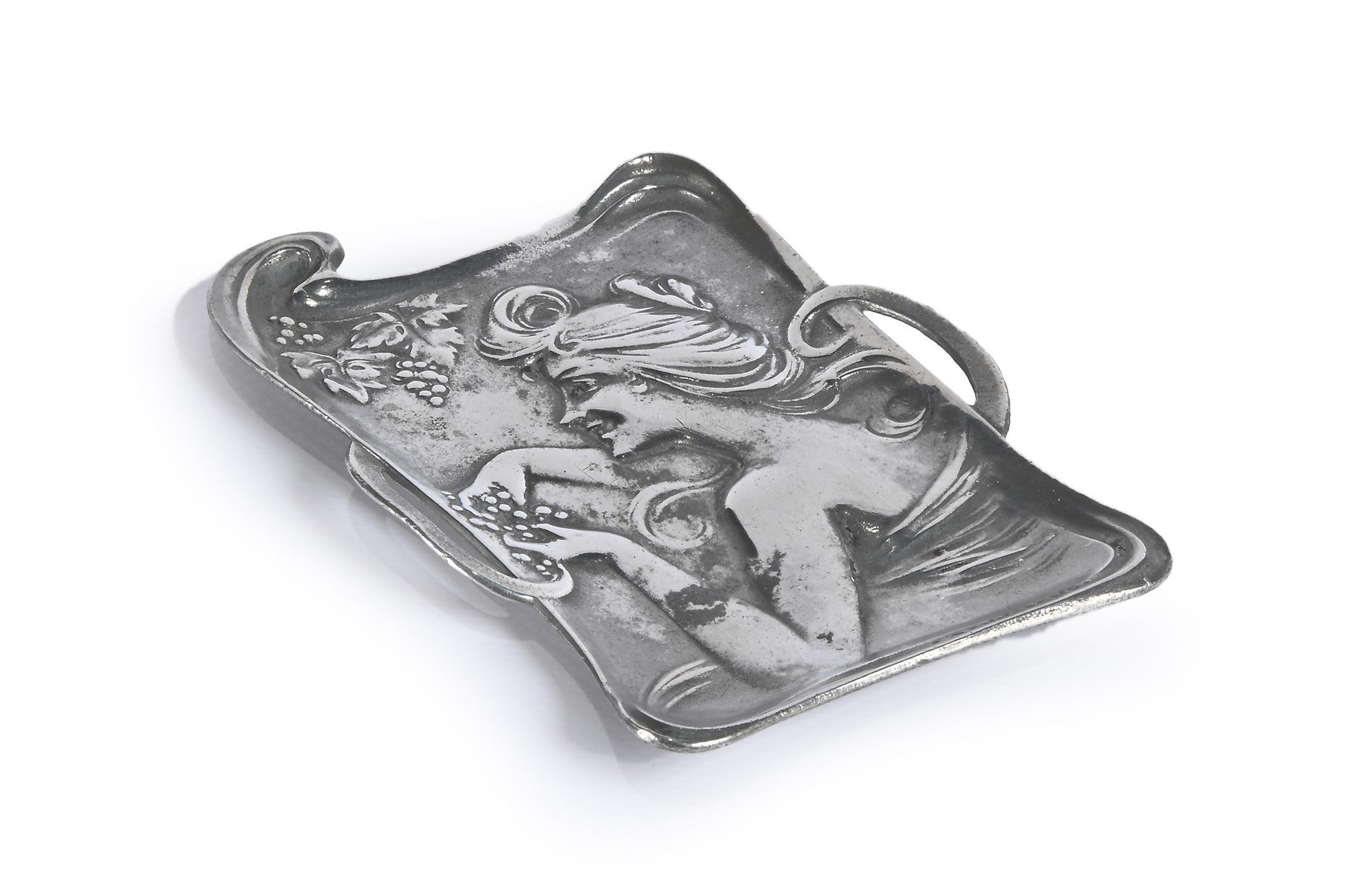 Piattino in peltro Art Nouveau, Claude Bonnefond (1868-1936) con figura femminile e profilo sagomato; firmato in basso a destra: C. Bonnefond. Al verso: BJM Paris Deposé cm 13x8,5