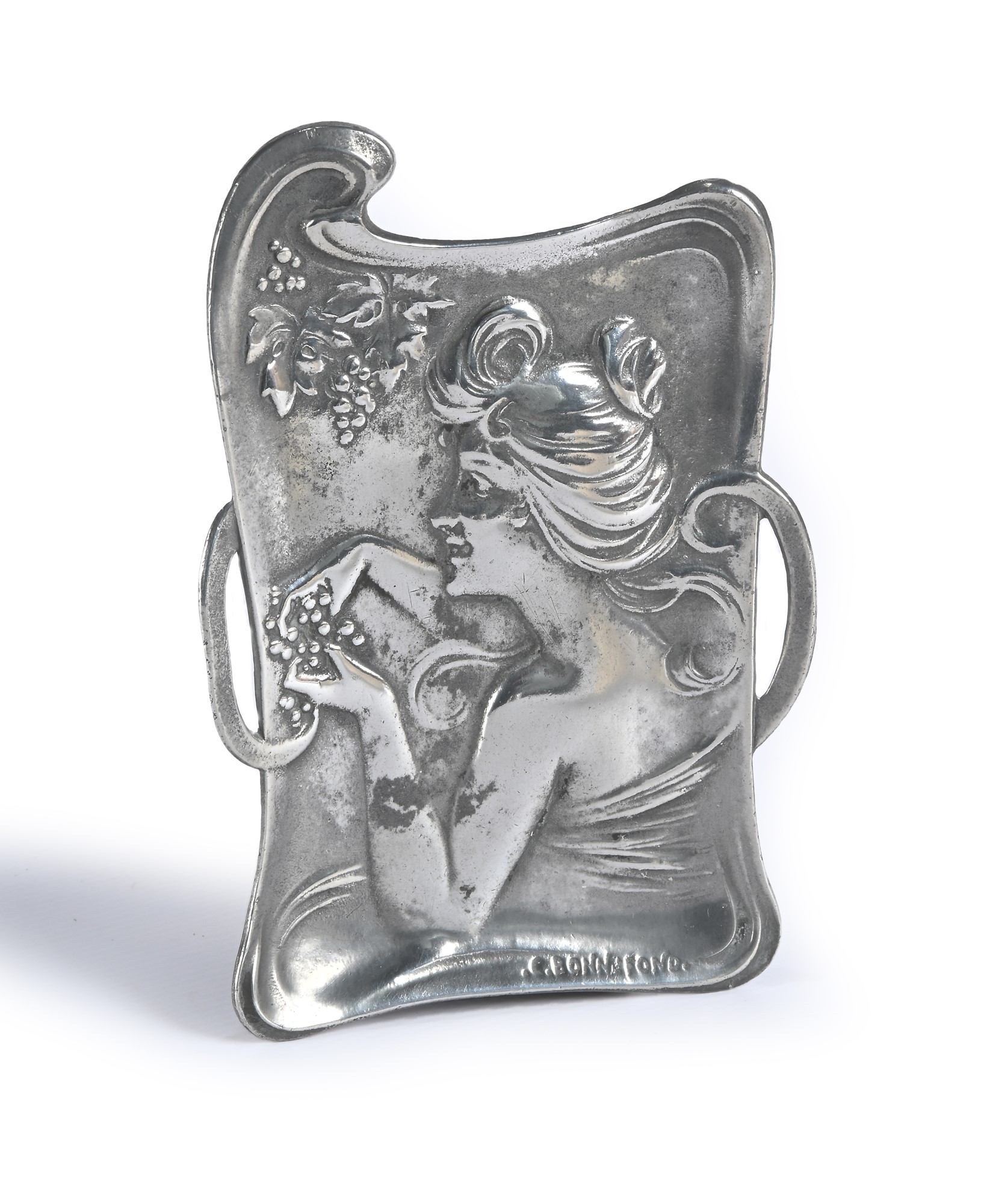 Piattino in peltro Art Nouveau, Claude Bonnefond (1868-1936) con figura...