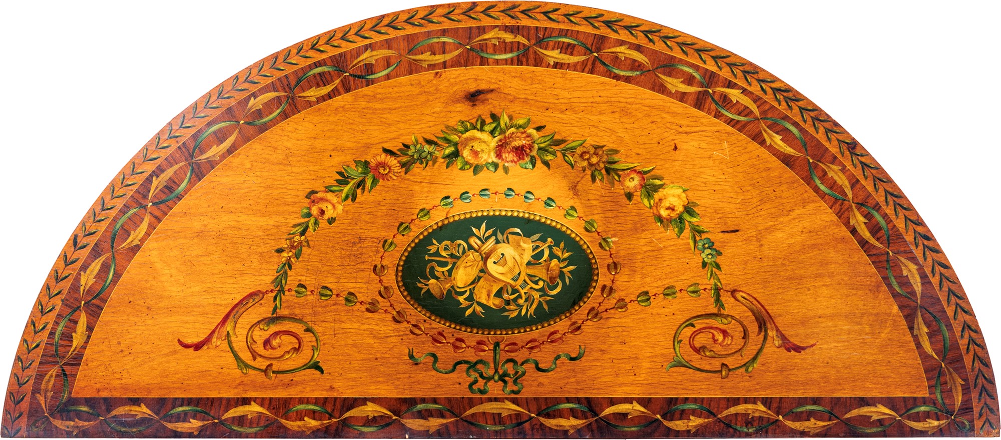 Coppia di consoles a mezza luna in satinwood, Regno Unito, Edoardo VII (1901 - 1910) piani centrati da un trofeo di strumenti musicali entro medaglione ovale circondato da festoni vegetali e ghirlande fiorite; ampia bordura percorsa da foglie intrecciate, delimitata da spighe che seguono l'intero perimetro; fascia ornata da una lunga ghirlanda sostenuta da corolle intorno alla quale si snoda un lungo nastro verde; gambe rastremate decorate da brevi cascatelle di ulivo sorrette idealmente da fiocchi