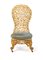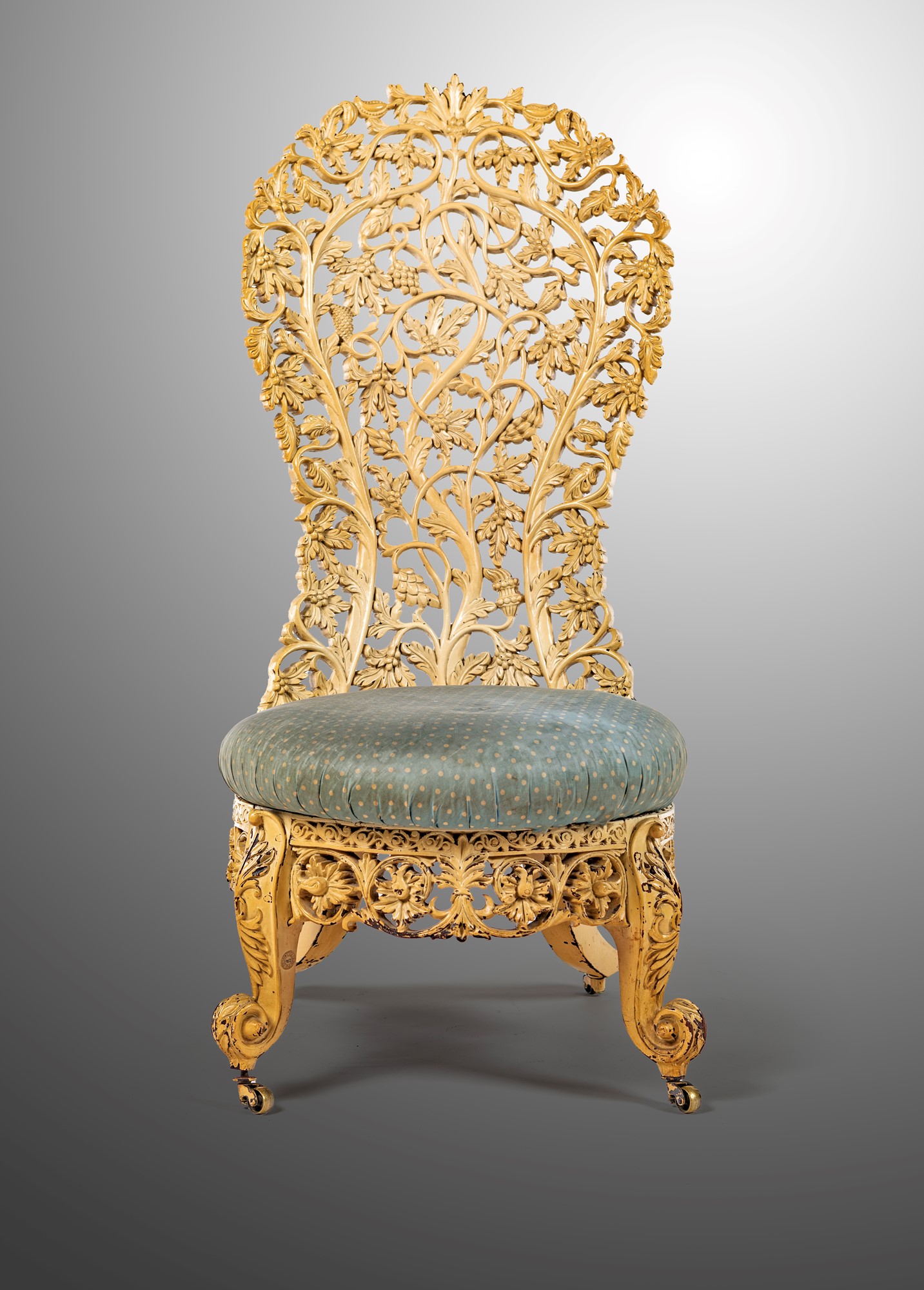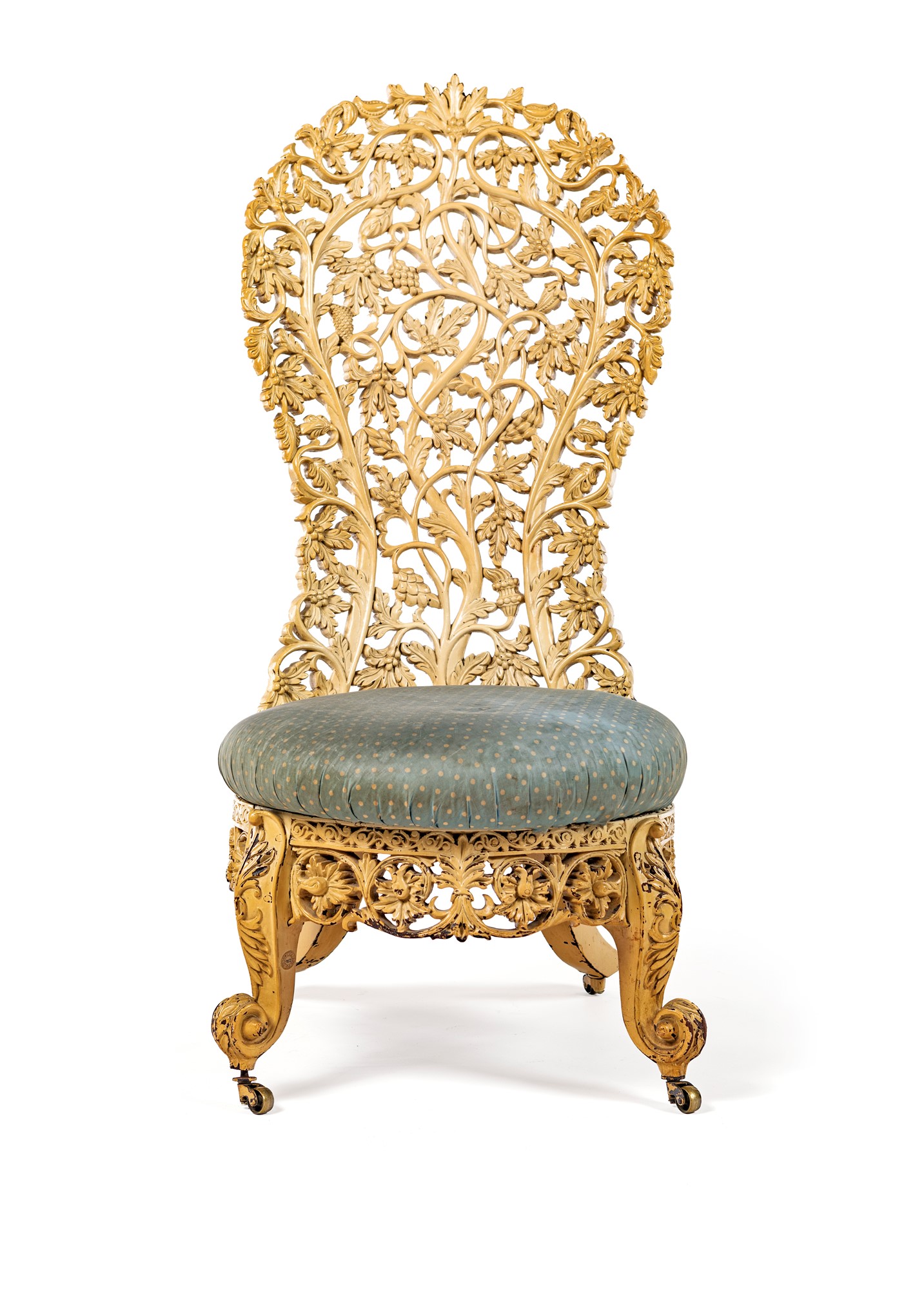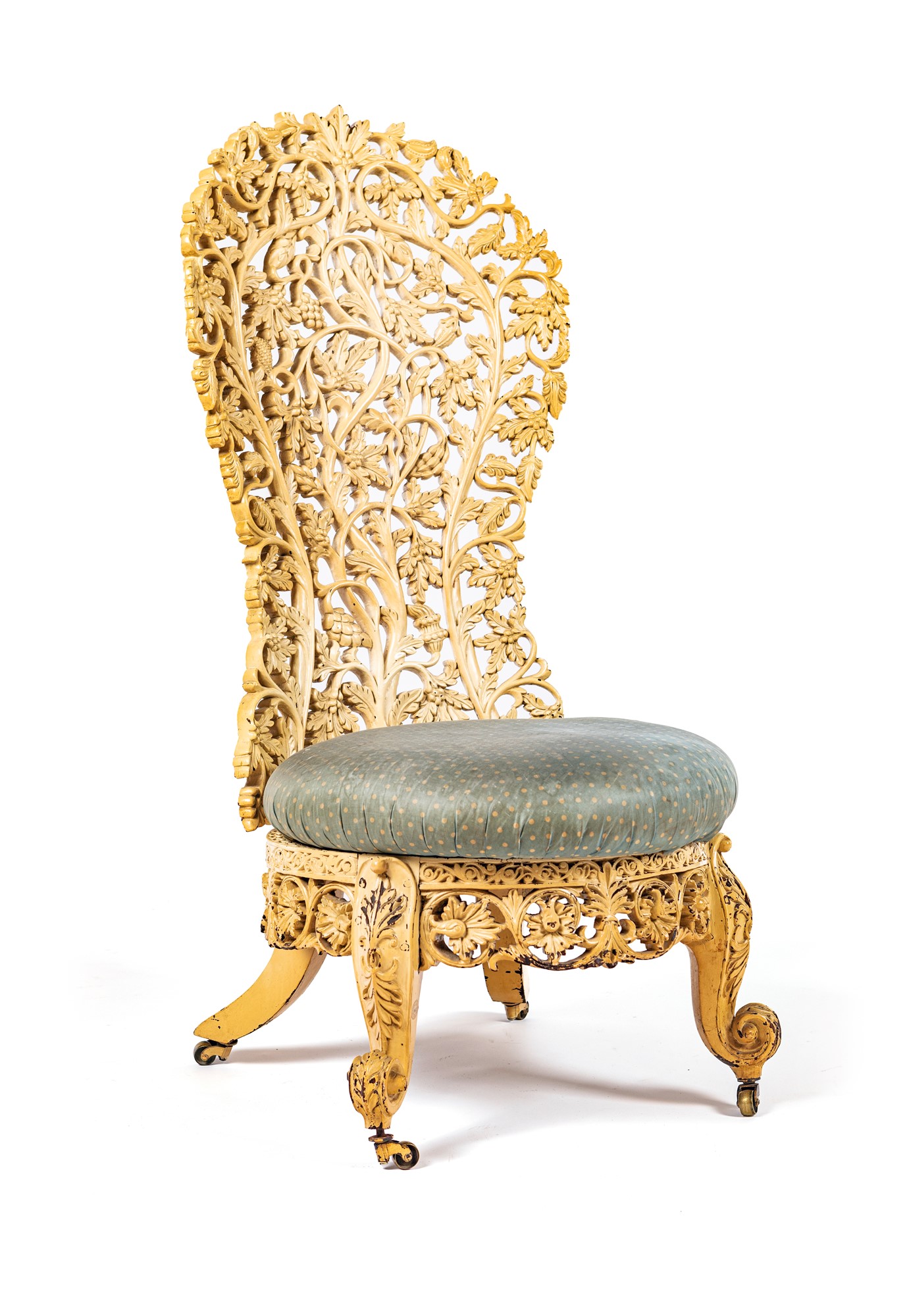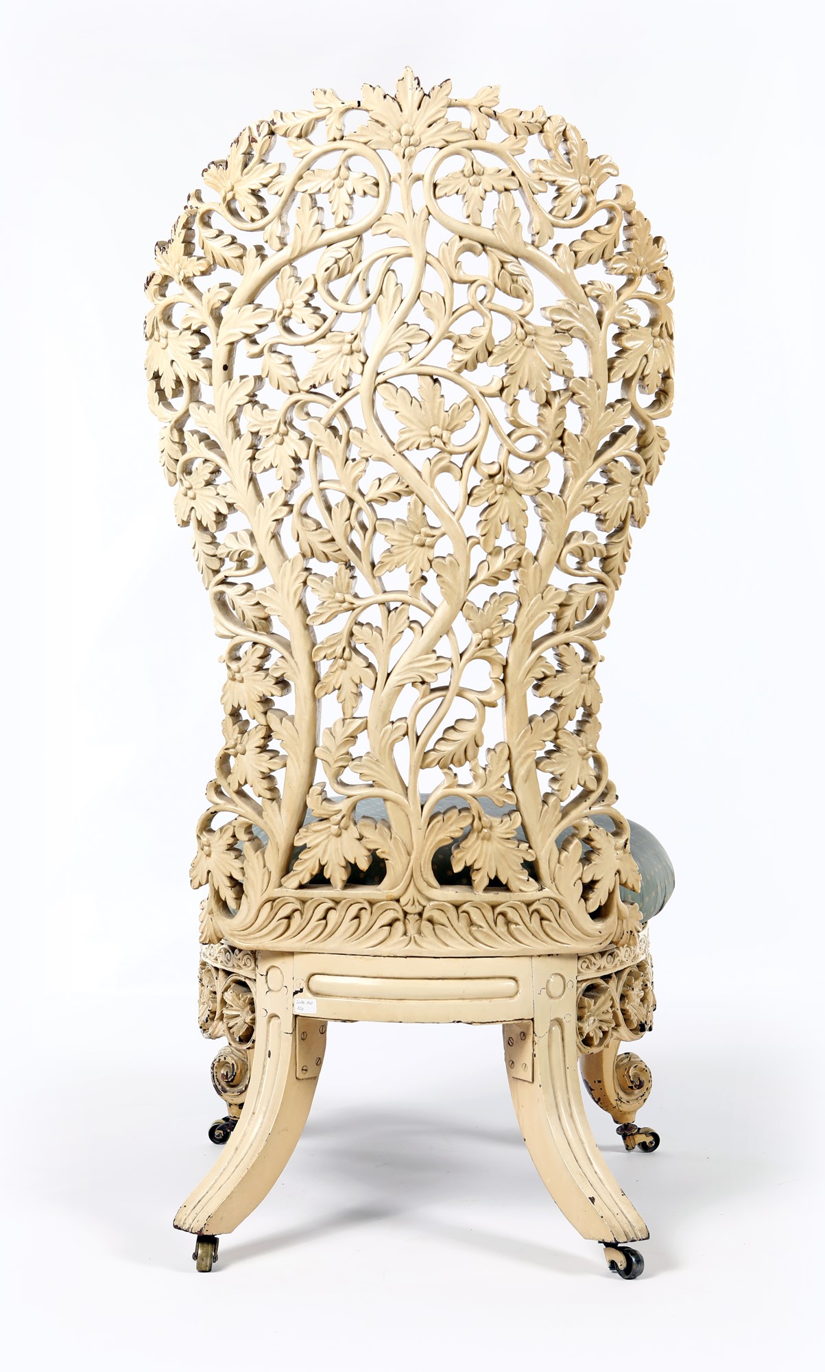 Poltrona coloniale in legno intagliato e laccato bianco, prima metà del XX secolo alto schienale a giorno costituito da un fitto intreccio a motivi vegetali, sedile imbottito, gambe mosse poggianti su ruote cm 120x55