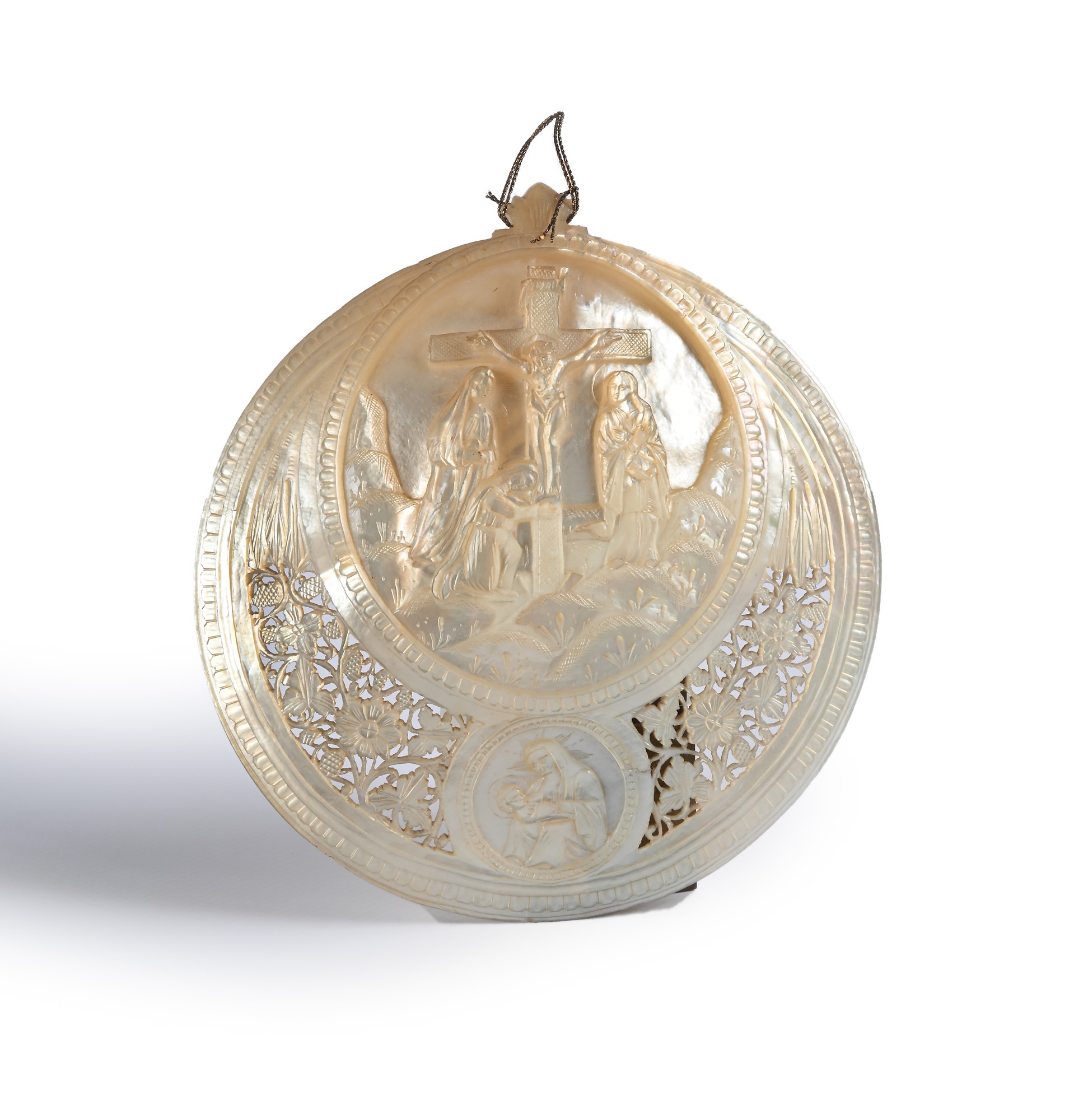 Conchiglia di madreperla intagliata, fine XIX/inizi XX secolo raffigurante la crocefissione con la Vergine, San Giovanni e la Maddalena inginocchiata; in basso, entro medaglione circolare, Madonna col Bambino; tutt'intorno fiori traforati. Questa tipologia di conchiglie, realizzate a mano a Betlemme e a Gerusalemme come souvenir di lusso per i pellegrini, sono da sempre considerate un prezioso oggetto da collezione