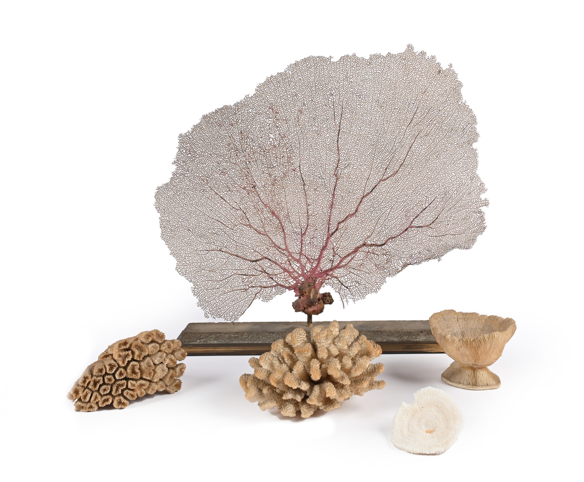 Tre gruppi diversi di madrepora, un ramo e un piccolo pesce fossile del Wyoming (periodo Eocene) cm 10x5 - 12x16x21 e 10x11 - ramo cm 58x54x11 - fossile cm 8x8 ca.
