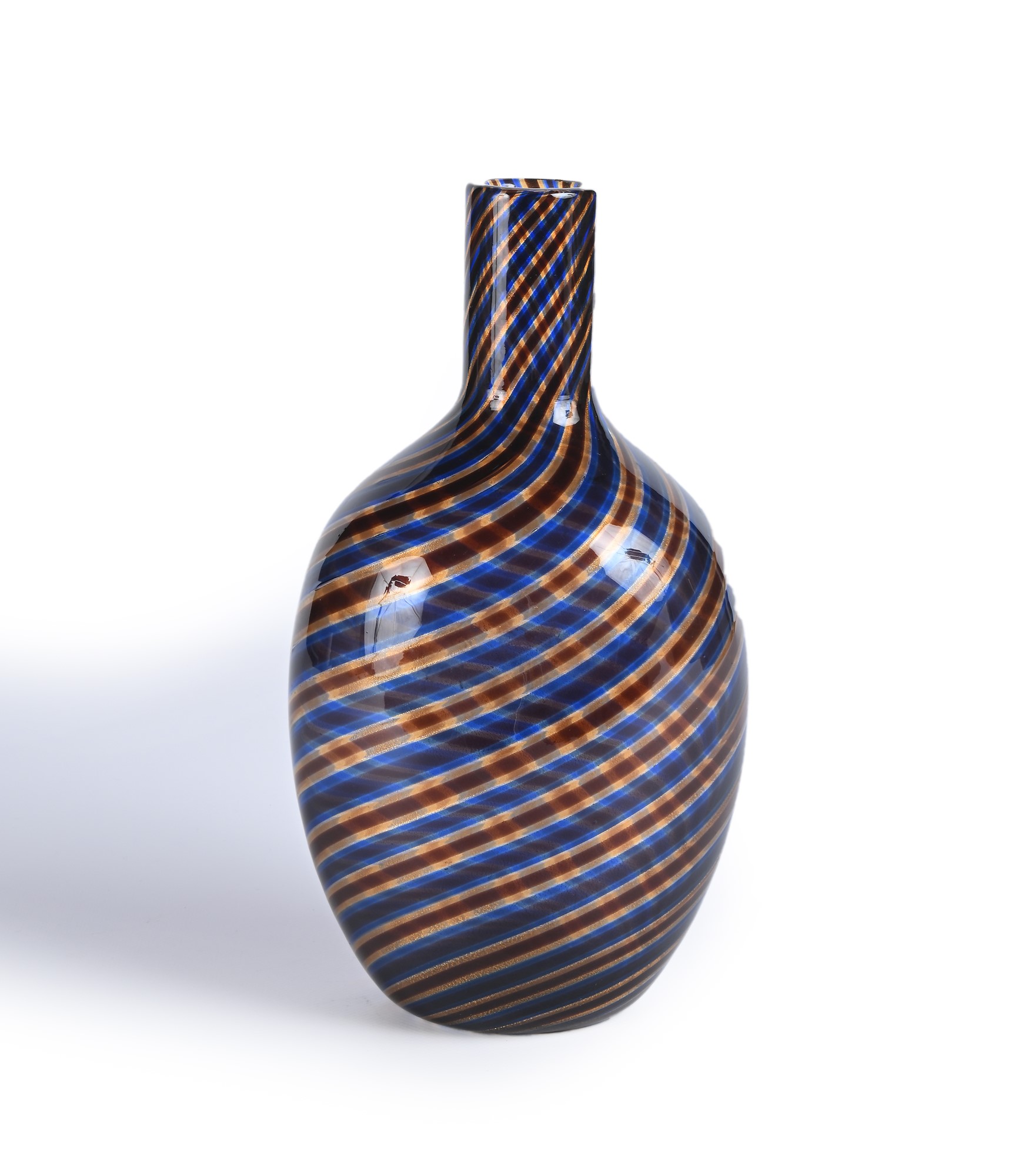 Barovier e Toso - Vaso in vetro soffiato, arte vetraria muranese con lavorazione a canne incolore, blu e rosso cupo con foglia d'oro caratterizzata da striature alternate ad andamento elicoidale