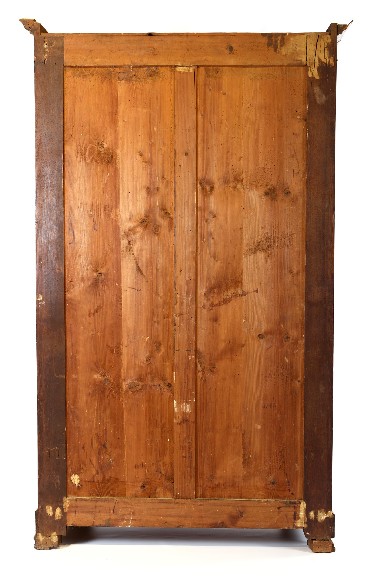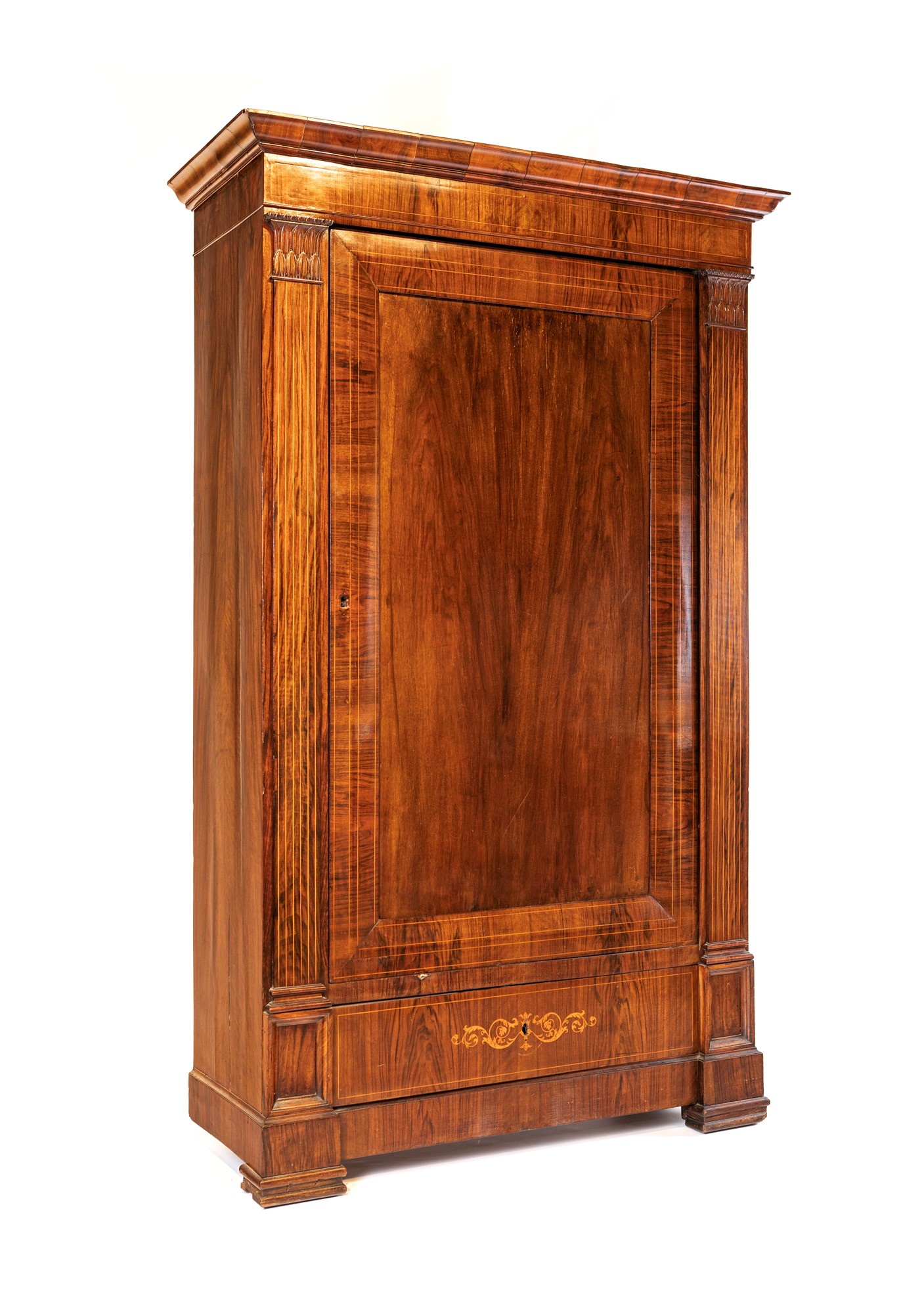 Armadio in palissandro con sottili filettature in legno di frutto, Italia meridionale, metà del XIX secolo caratterizzato da un'anta frontale con specchiatura incassata ed un cassetto sottostante decorato da una minuta tarsia a volute vegetali; lesene percorse da sottili filettature intarsiate, rifinite superiormente da capitelli intagliati delimitano la facciata; piedi a mensola cm 200x120x50