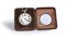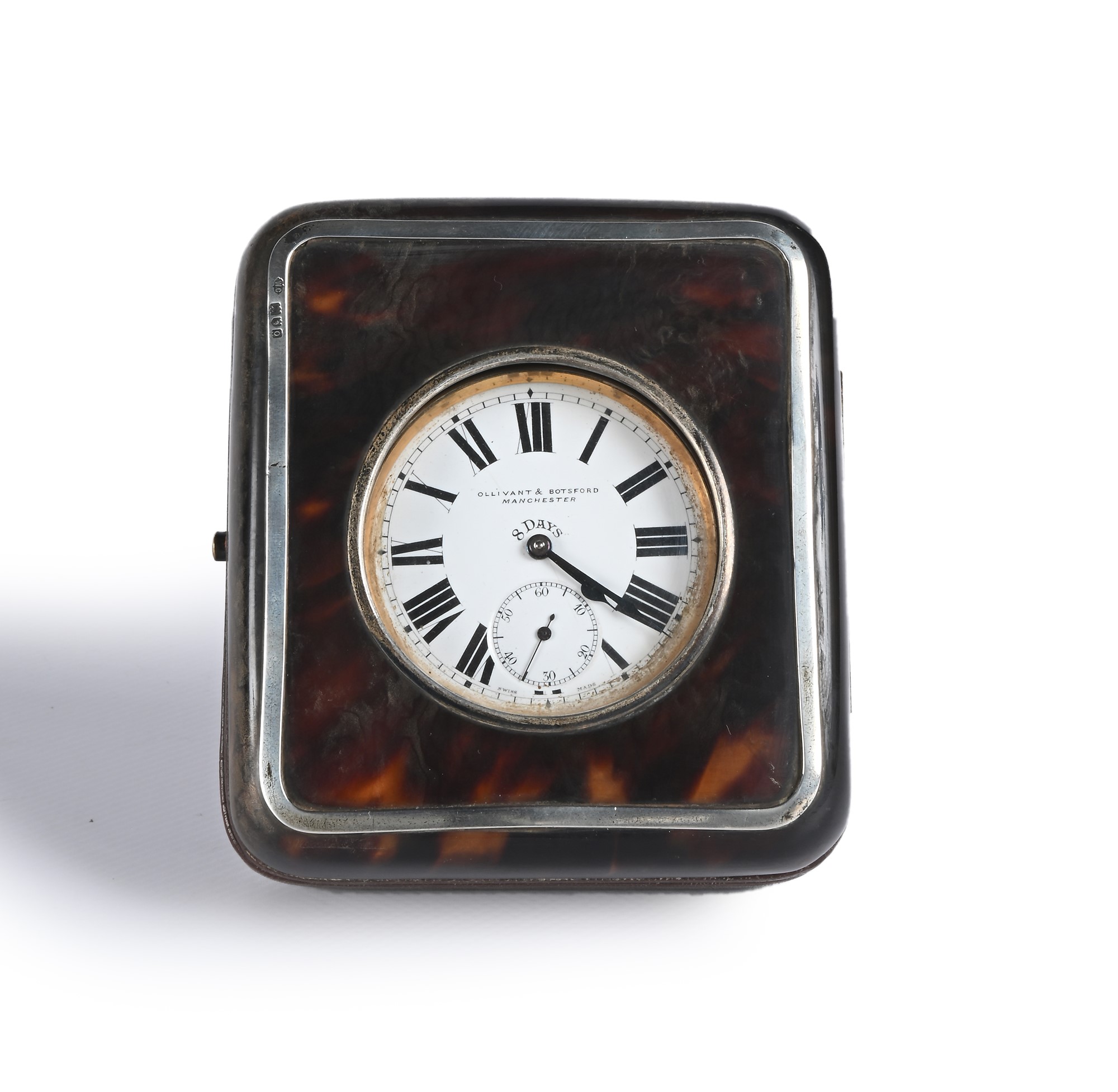 Sveglia da viaggio Ollivant & Botsford, Manchester carica otto giorni, custodia in pelle, bachelite tartarugata e filettatura in argento cm 11,5x10