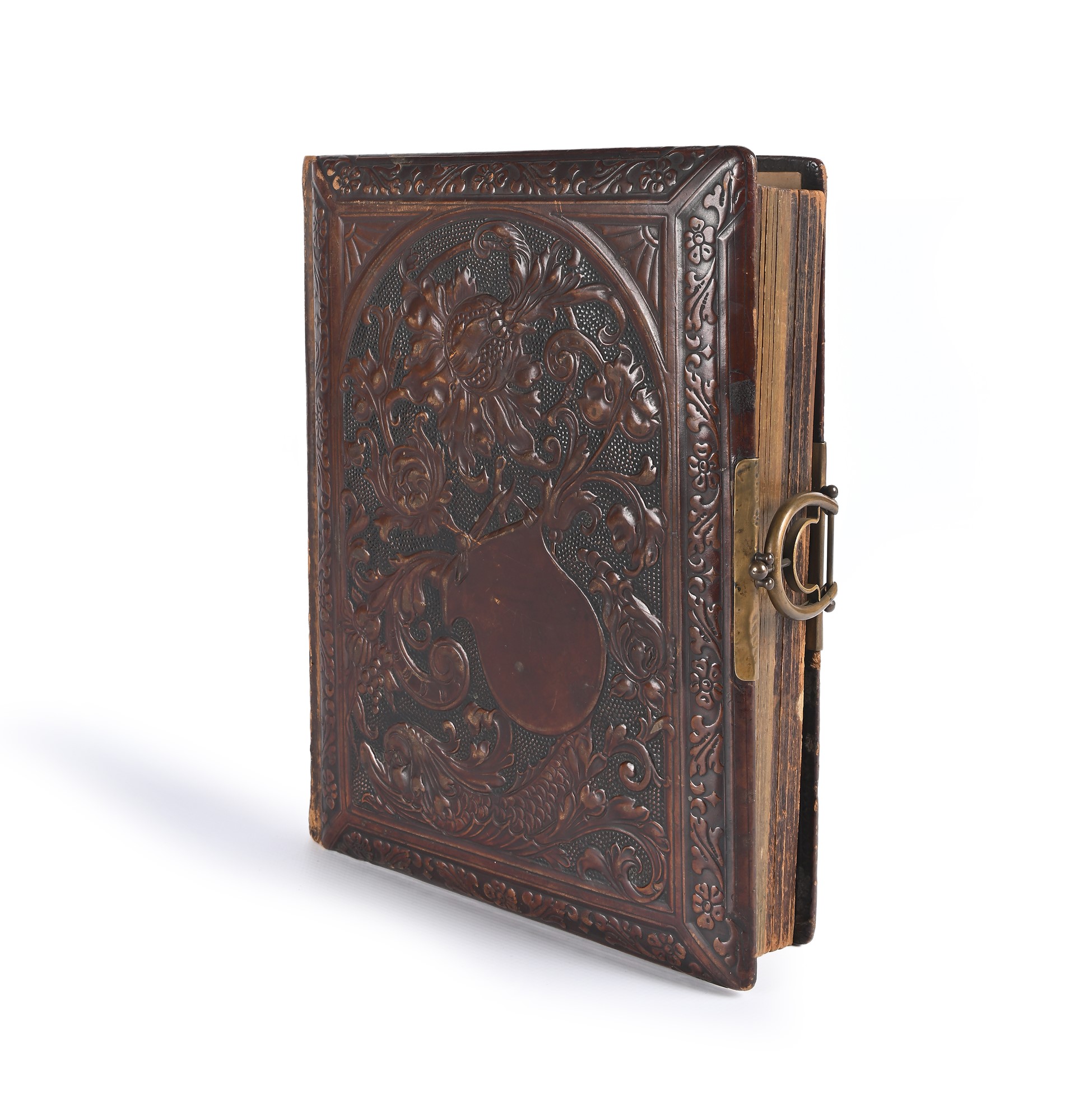 Album portaritratti in pelle impressa con quindici pagine cartonate contenenti vani di diversa misura e forma; chiusura in bronzo