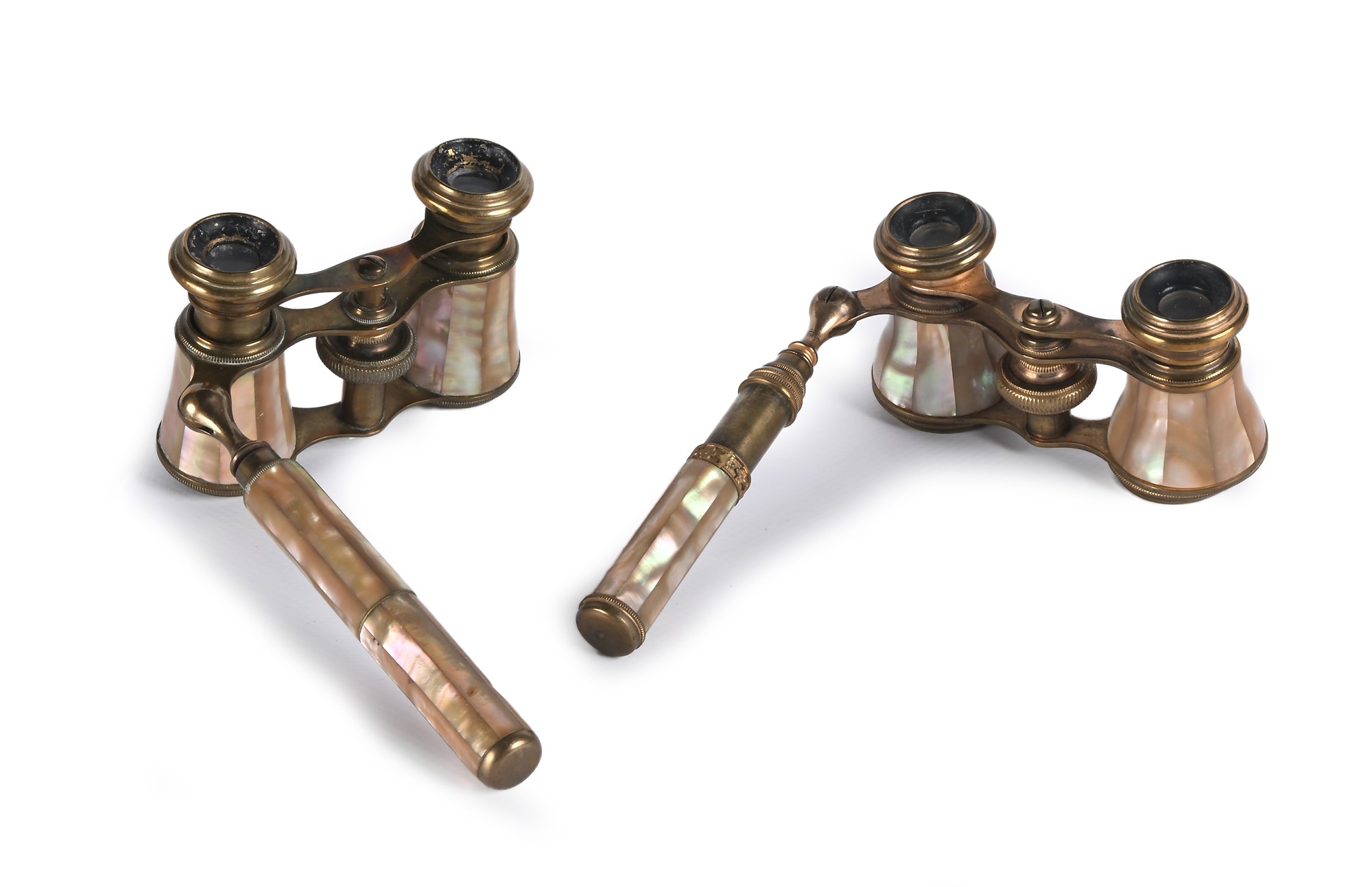Due binocoli da teatro in ottone e madreperla, Francia, fine del XIX secolo dalla analoghe caratteristiche con manico pieghevole