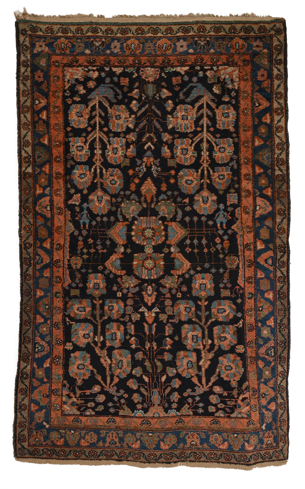 Tappeto fondo blu caratterizzato da quattro rami fioriti stilizzati disposti ai quattro angoli; al centro piccole corolle; piccole bordure cm 206x130