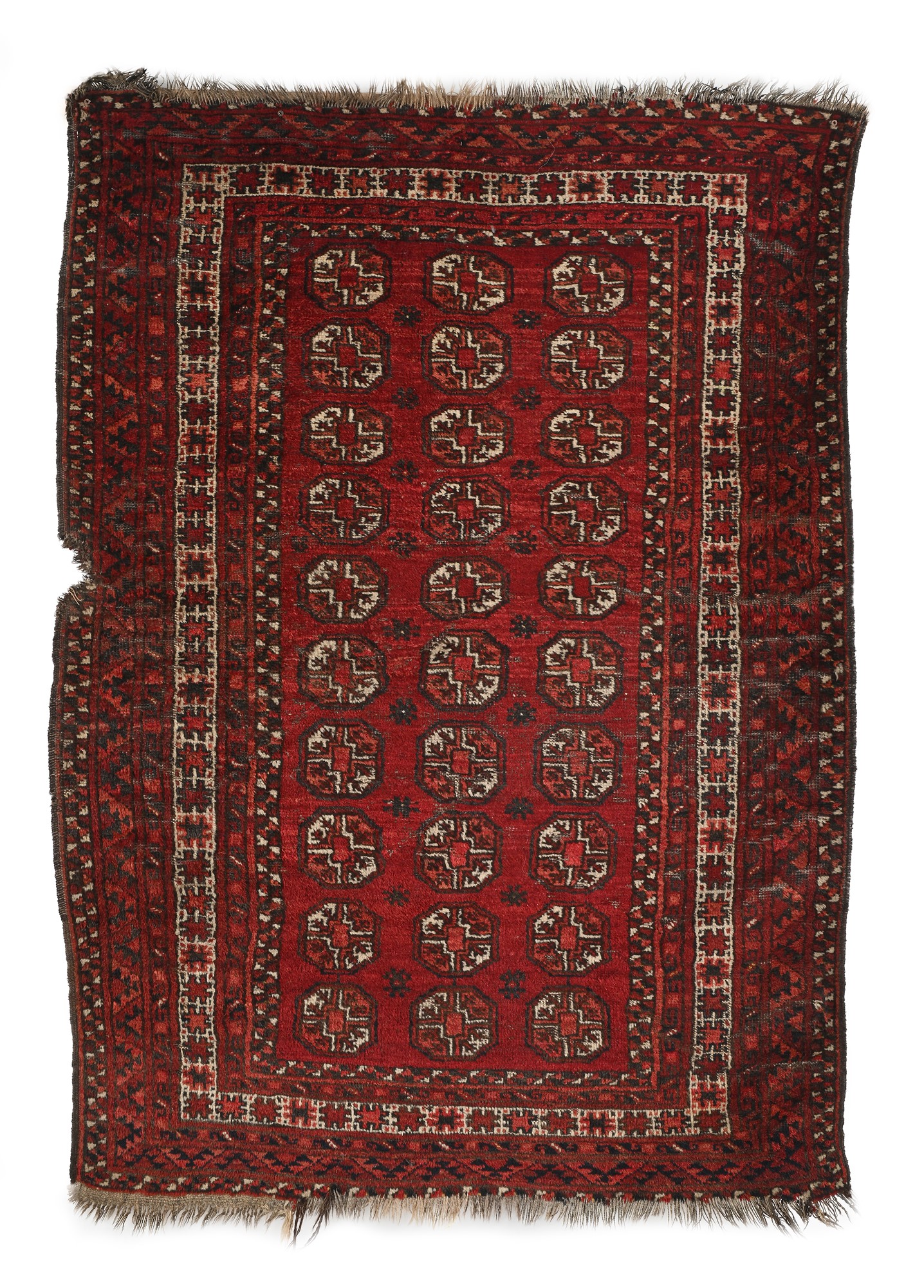 Antico tappeto Bukhara fondo rosso caratteristico disegno a gul disposti su tre file parallele; molteplici piccole bordure, la principale bianca. Consunto cm 185x132