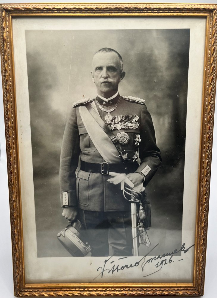 31 x 20,9 cm Fotografia datata e firmata di Vittorio Emanule III. La cornice di Ermanno Baldiserra e la fotografia si presentano in ottimo stato di conservazione.