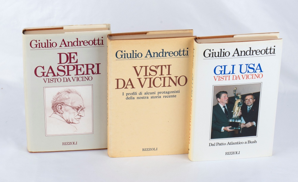 Lotto di tre volumi, ognuno con dedica e firma autografa di Giulio Andreotti, scritte di pugno.