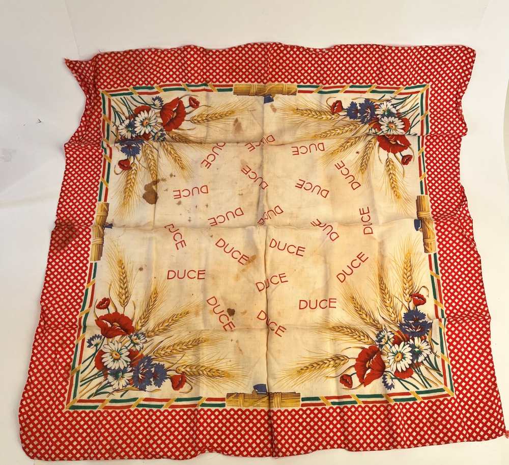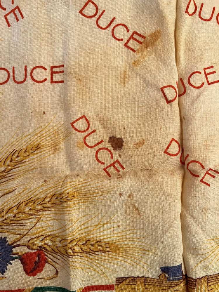 Foulard in cotone stampato per le massaie rurali, propagandistico della BATTAGLIA DEL GRANO, durante il ventennio fascista, inneggiante al DUCE