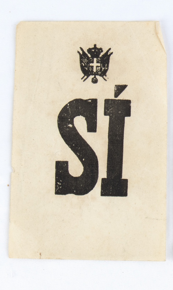 cm.8,5x13,5 Rarissima scheda "SI" per il voto al Plebiscito di Unità Nazionale degli anni 1860/1870, presumibilmente usata per la votazione nell'allora uscente Regno delle Due Sicilie, o per l'annessione al Regno d'Italia dei territori di Roma e provincia e delle province di Civitavecchia, Frosinone, Velletri e Viterbo che si svolse il 2 ottobre 1870. In carta leggera, con stampa tipografica ad inchiostro nero del "SI" in lettere maiuscole sormontato dallo stemma di casa reale Savoia, in eccellenti condizioni con lievi pieghe e segni sparsi. Misure cm.8,5x13,5