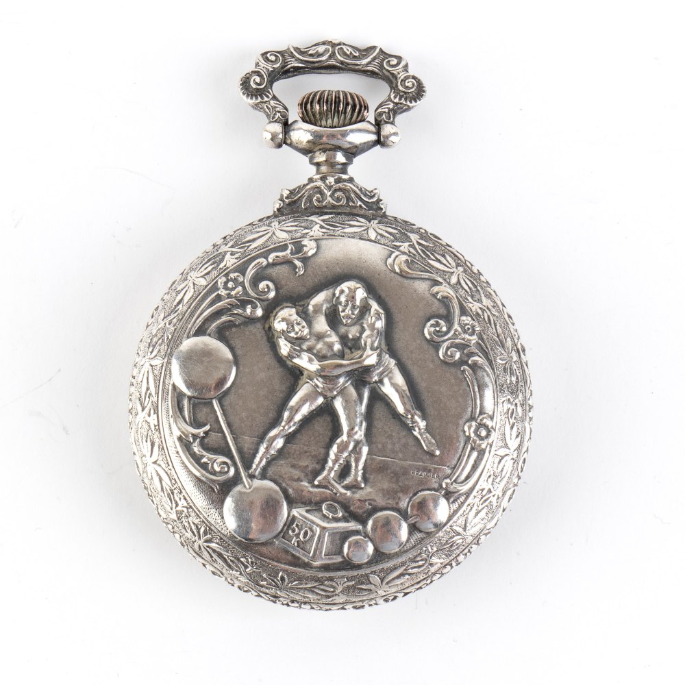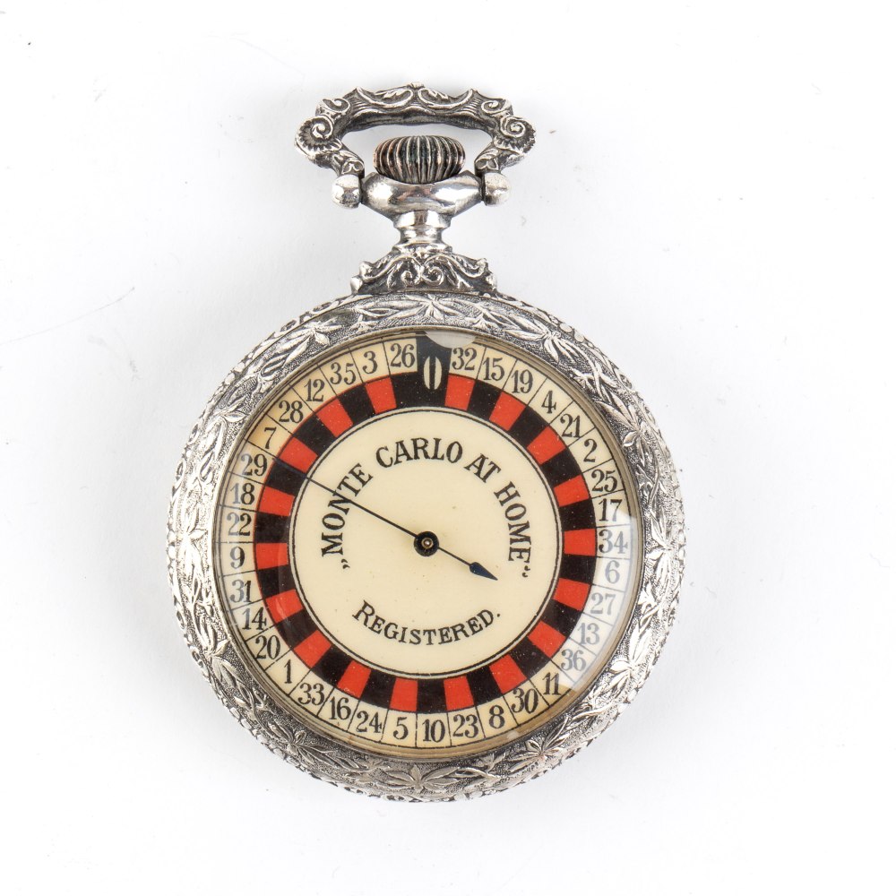 Simpatico gadget a forma di orologio da tasca, cipollotto, pubblicitario del Casinò di Monte Carlo. Roulette tascabile, MONTE CARLO AT HOME , in metallo argentato, con immagini a sbalzo di lottatori di greco-romana, atletica pesante. Funzionante. Firmato RAINIER in basso ad ore 5 sul retro della cassa . Inizio '900. Perfette condizioni