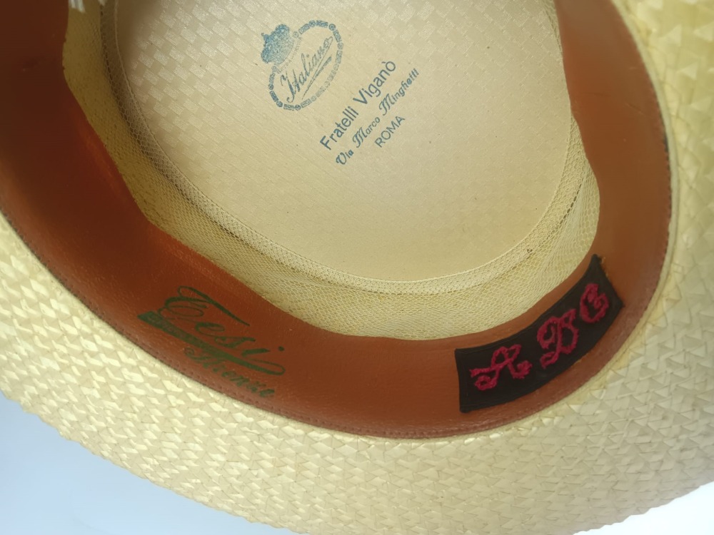 Al suo interno sono presenti le lettere ADC ricamate in filo rosso su targhetta in stoffa nera. Fabbricante Tesi, Firenze – Fratelli Viganò, Roma. La paglietta in oggetto è quasi uguale a quella indossata da Totò nella foto autografata nel 1919, anche questa in asta.