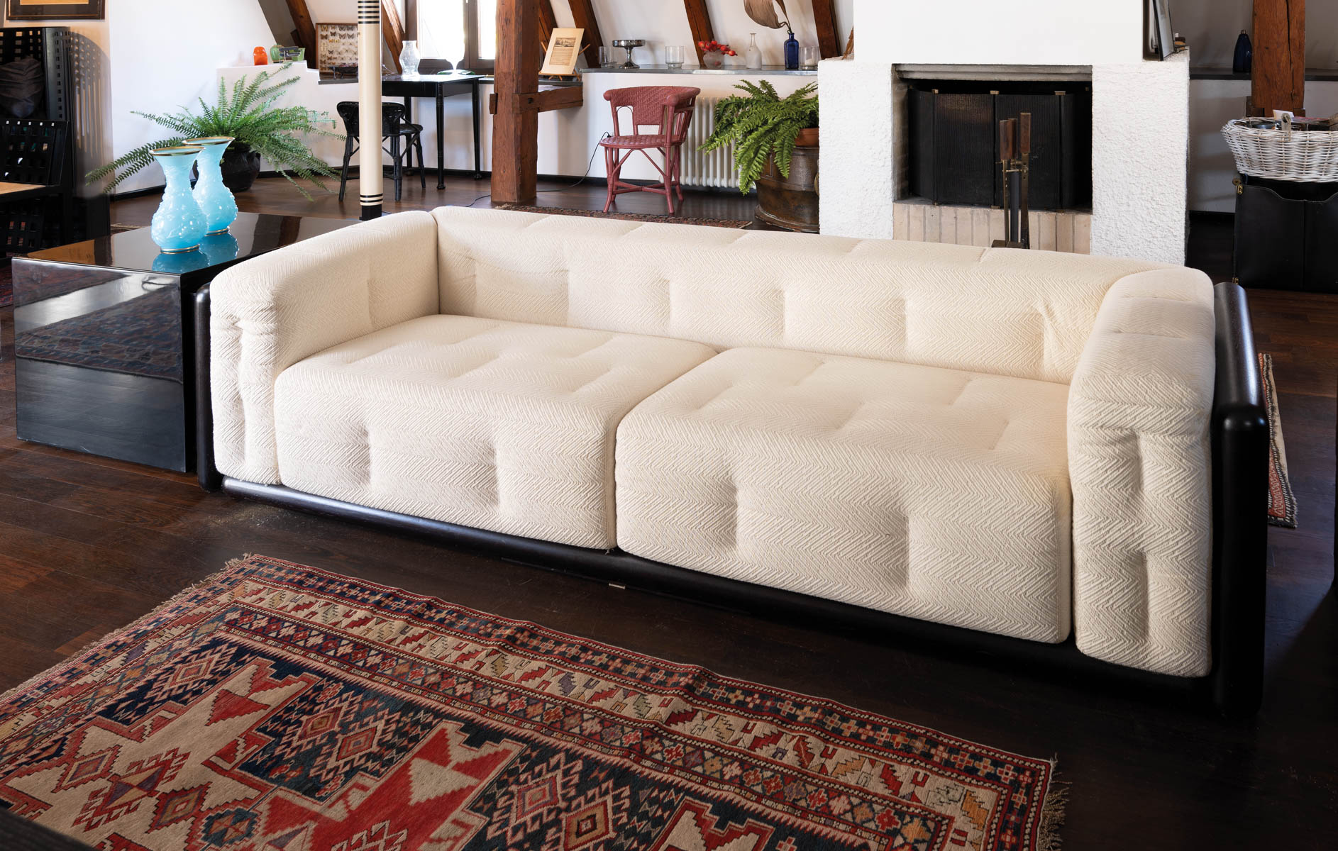 Carlo Scarpa Divano modello Cornaro;Legno tornito e verniciato, imbottitura in tessuto