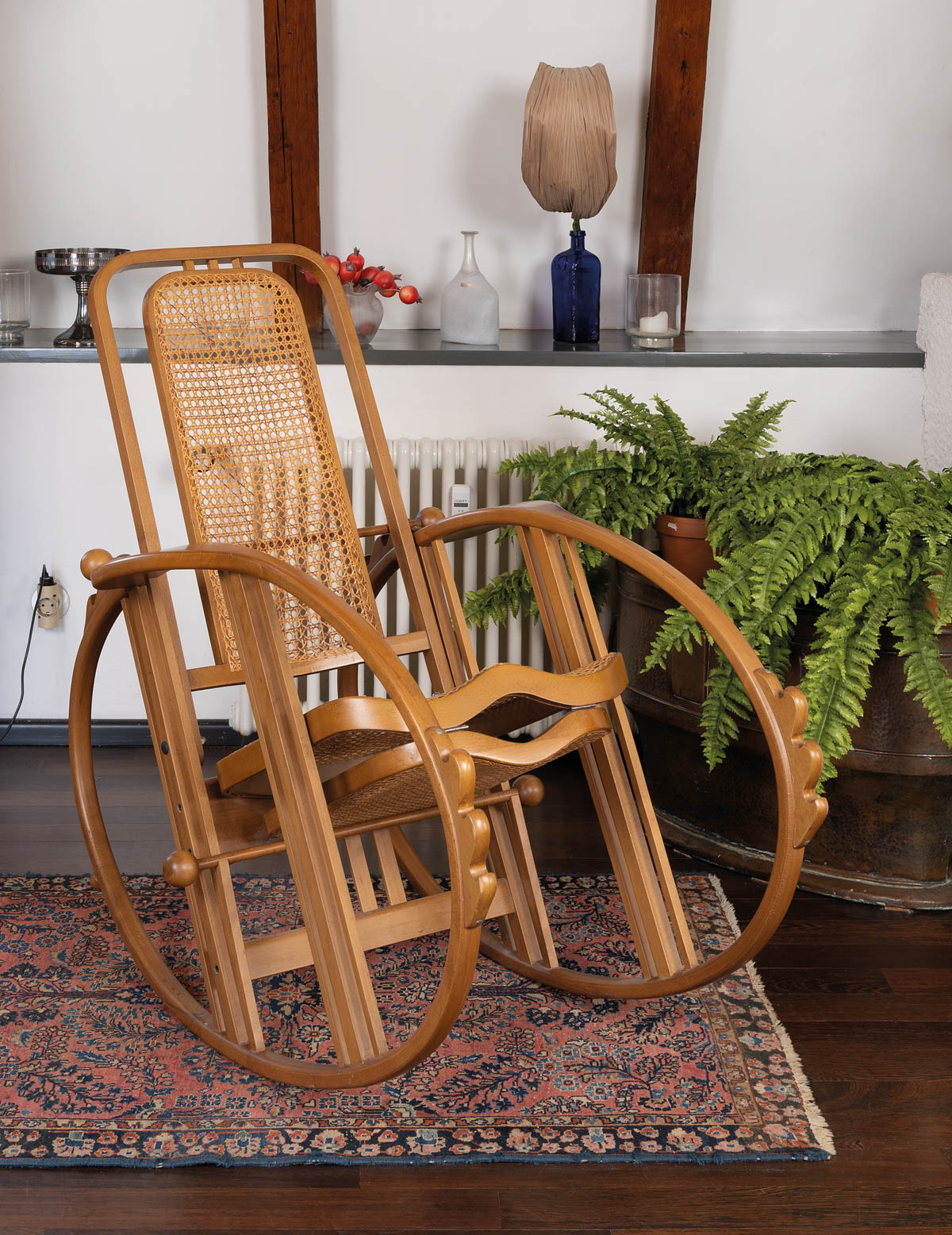 Volpe Antonio / Josef Hoffmann Sedia a dondolo modello Egg-Rocking-Chair, legno di faggio ricurvo e ratan,
