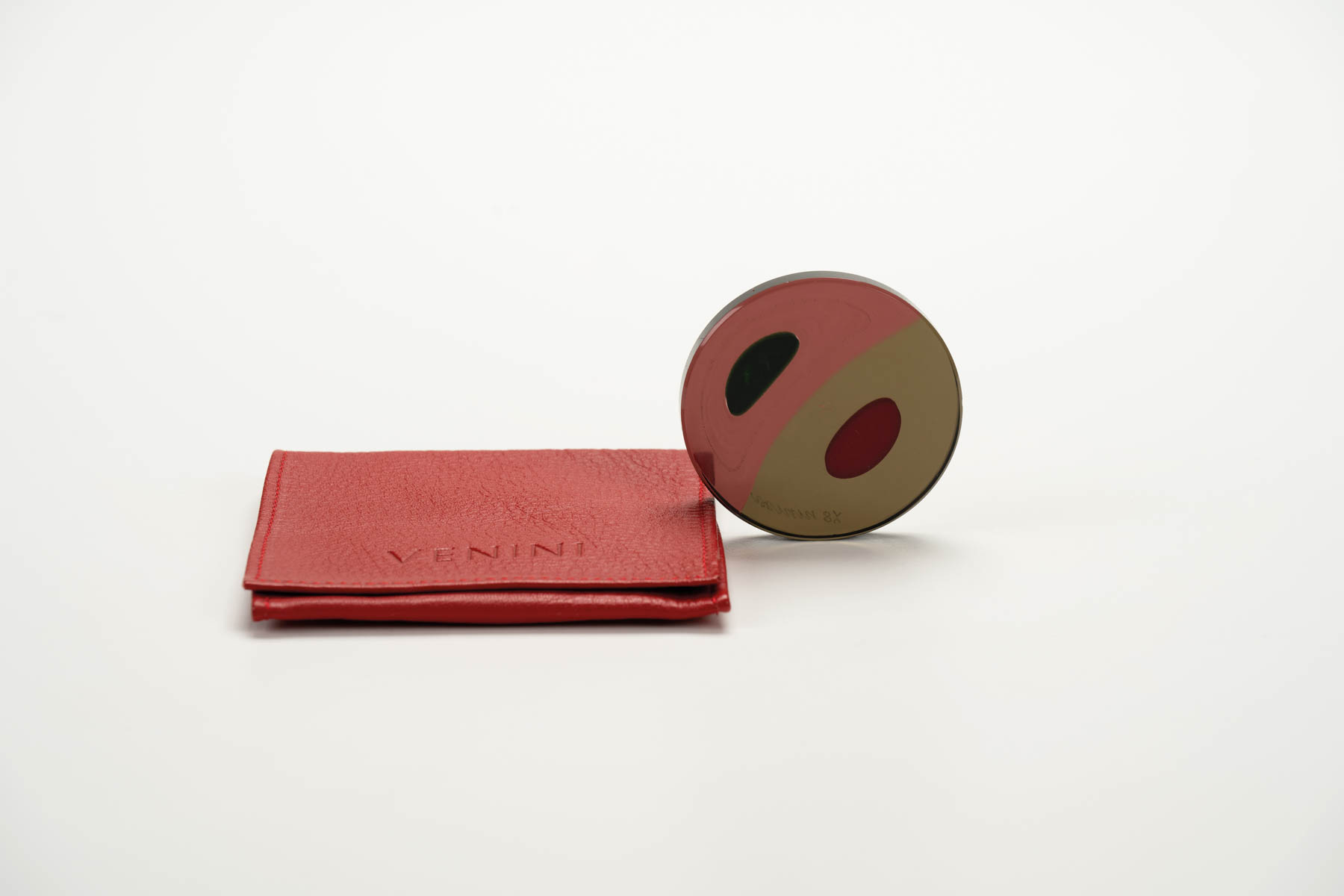 Venini Murano Murrina;Esemplare di antica lavorazione di origine romana valorizzata da Venini attraverso un sapiente impiego dei colori, diametro 6 cm, custudio in pelle rossa assieme a cartellino esplicativo Venini