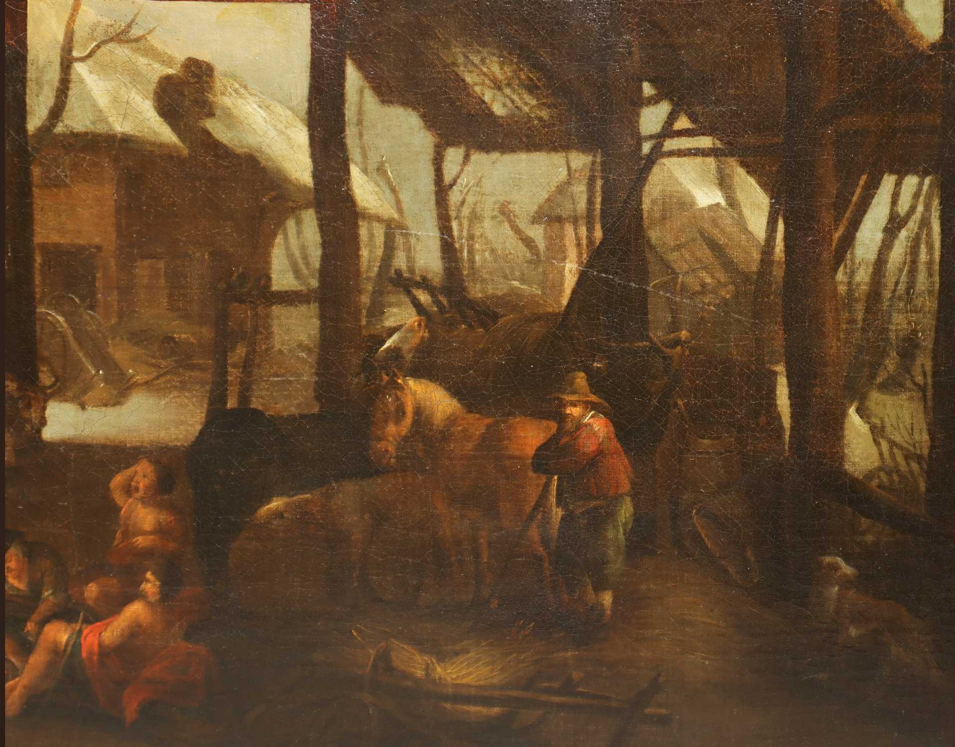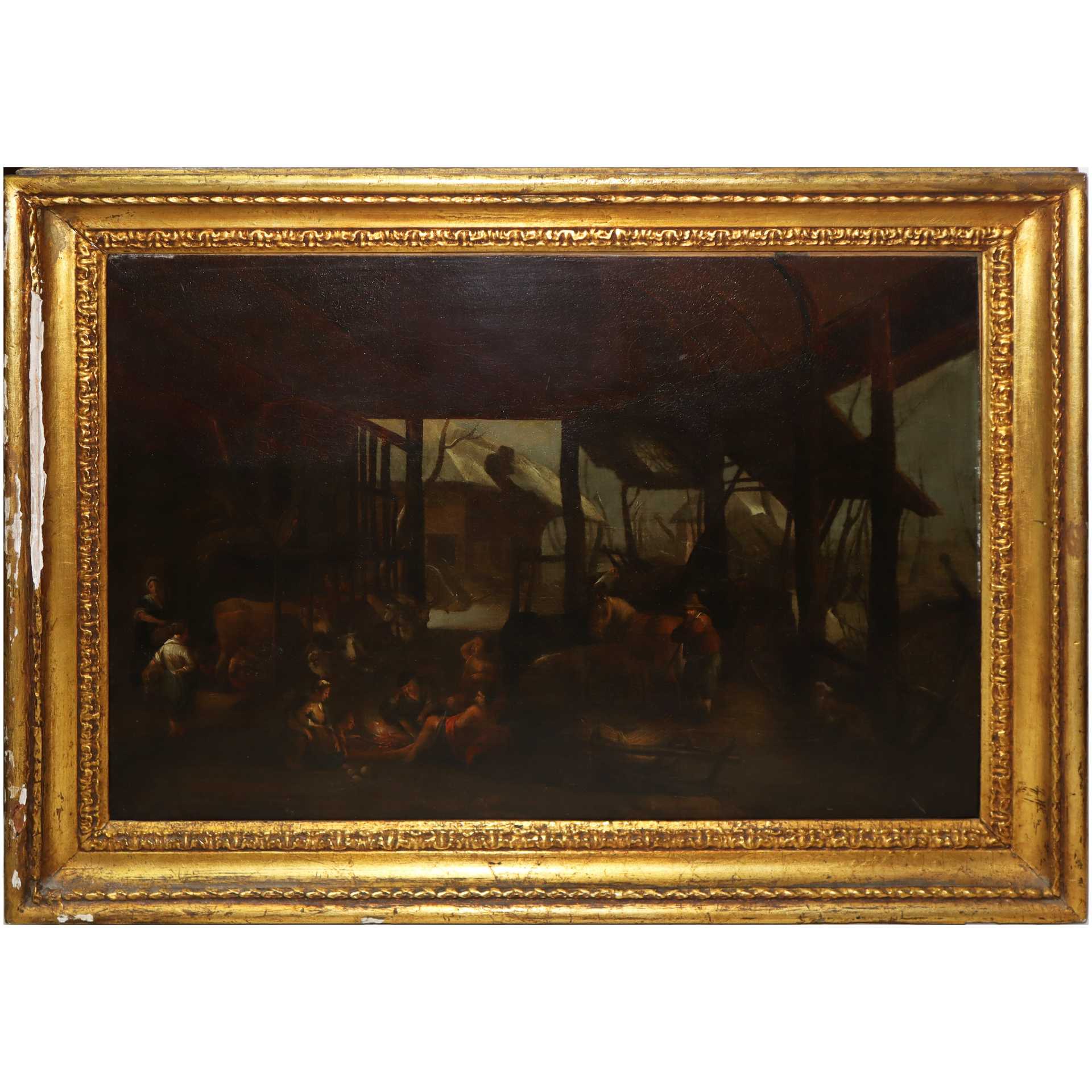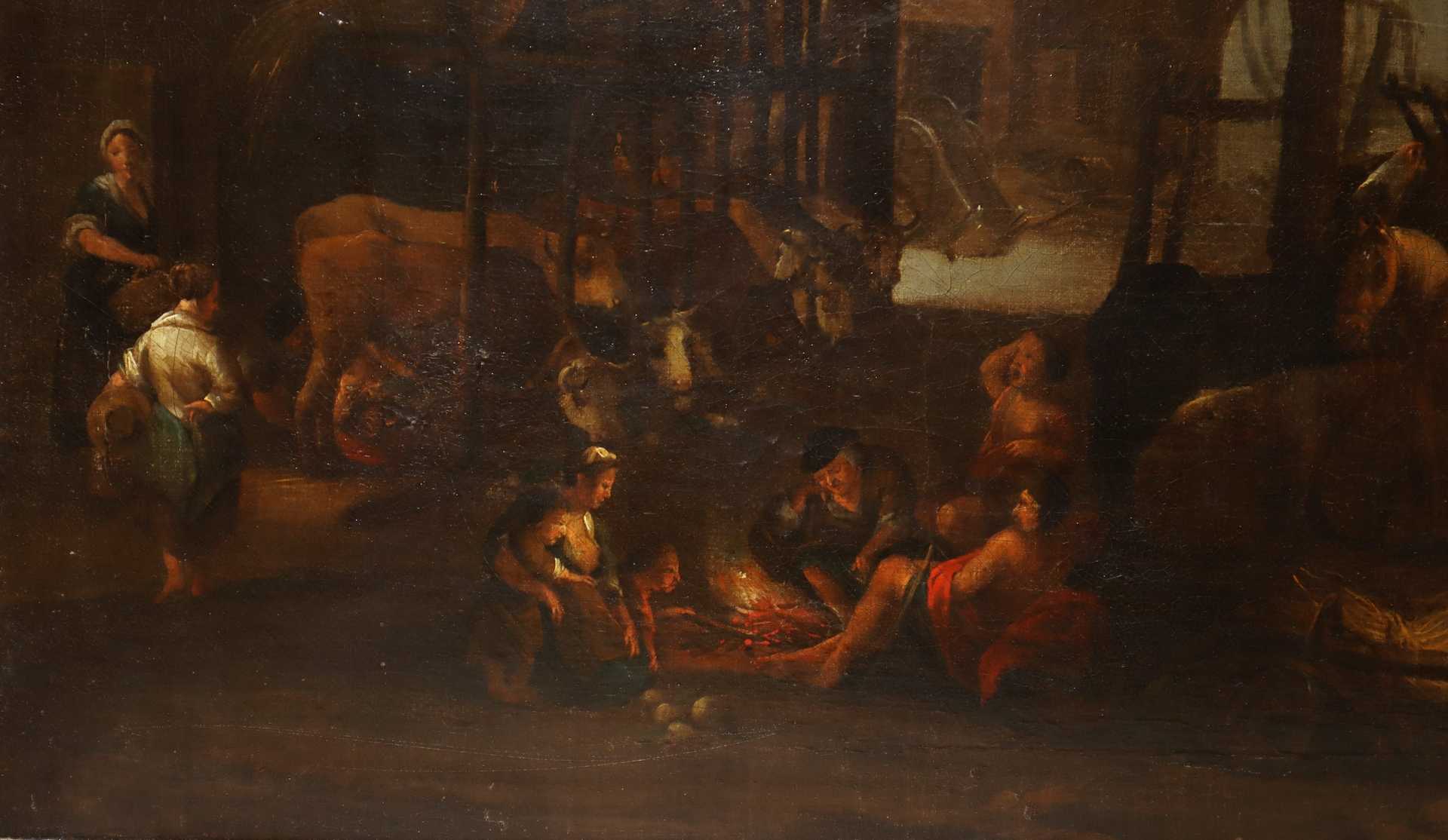 Cornelis de Baellieur (attribuito a) (Anversa 1607-1671) - Interno di stalla con personaggi e anima