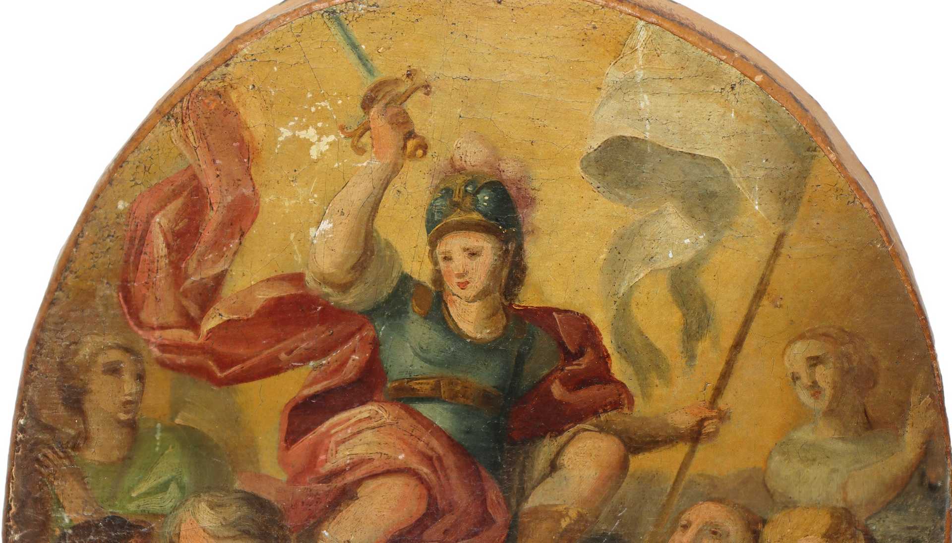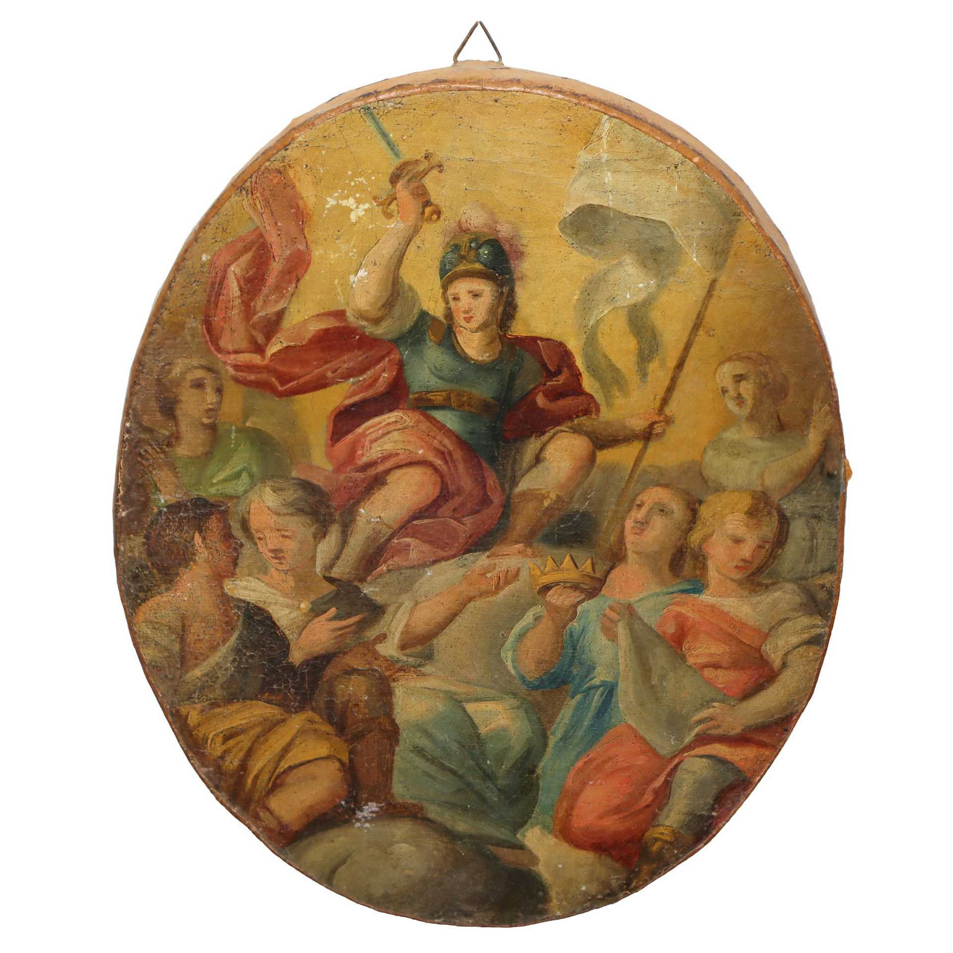 Allegoria della Giustizia, 18° Secolo H cm 28x22 Olio su tela Telaio ovale.