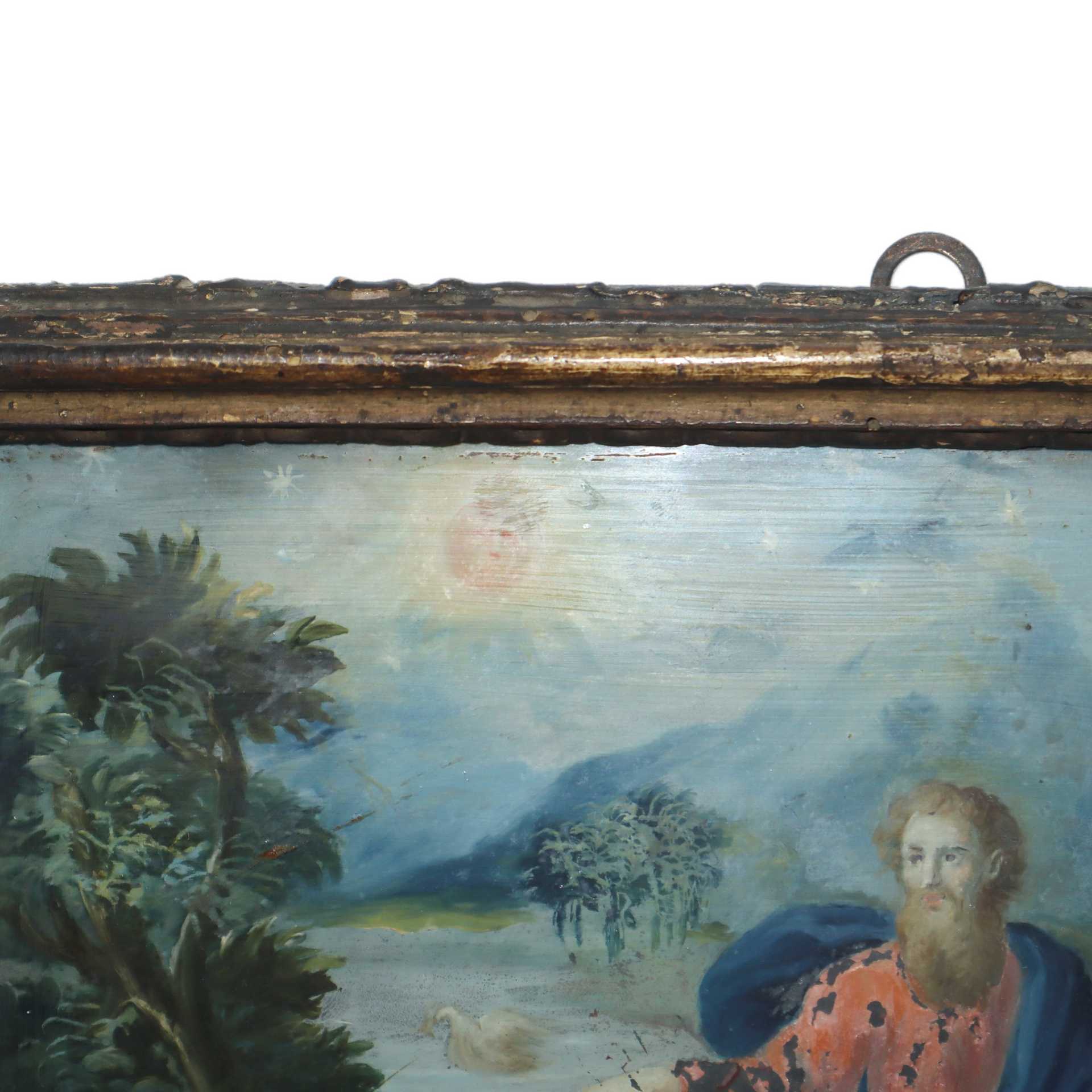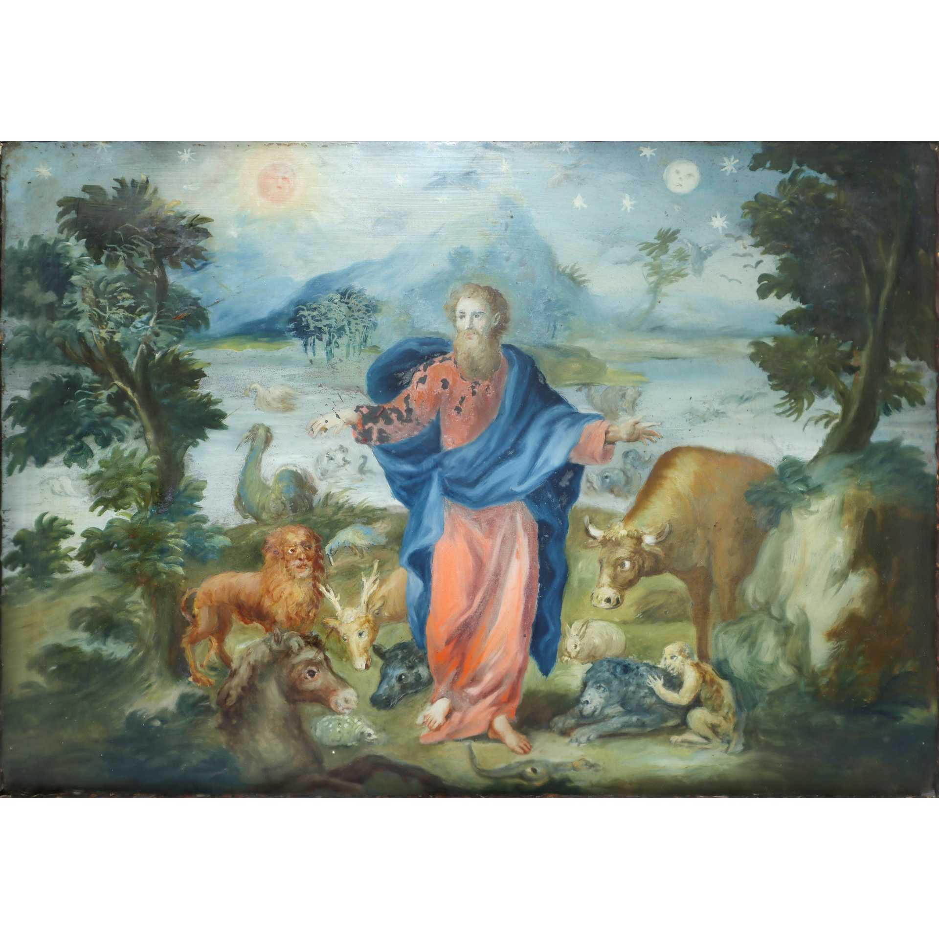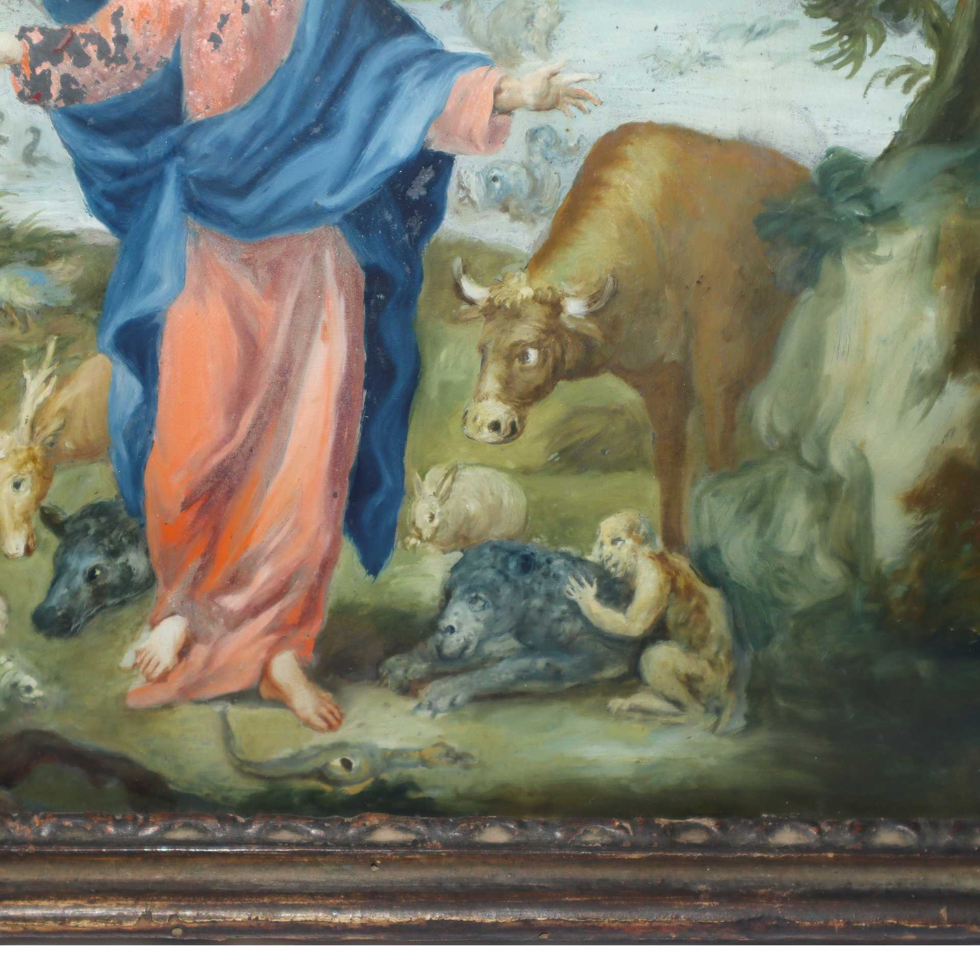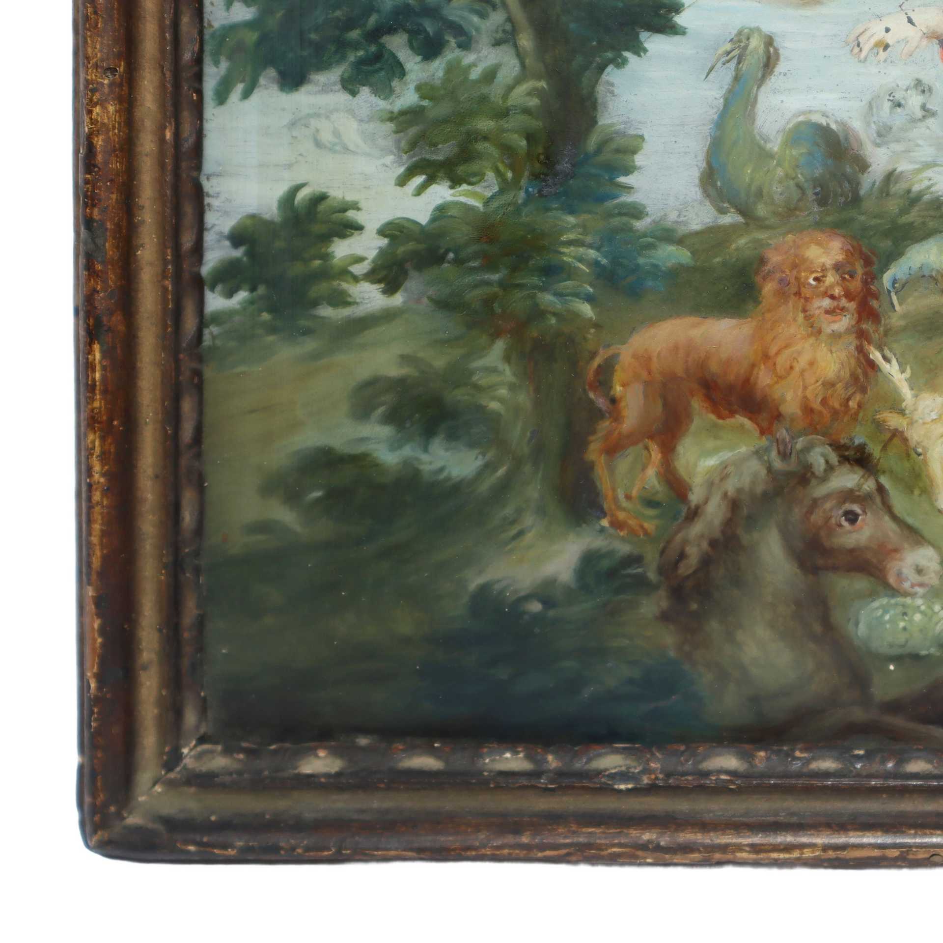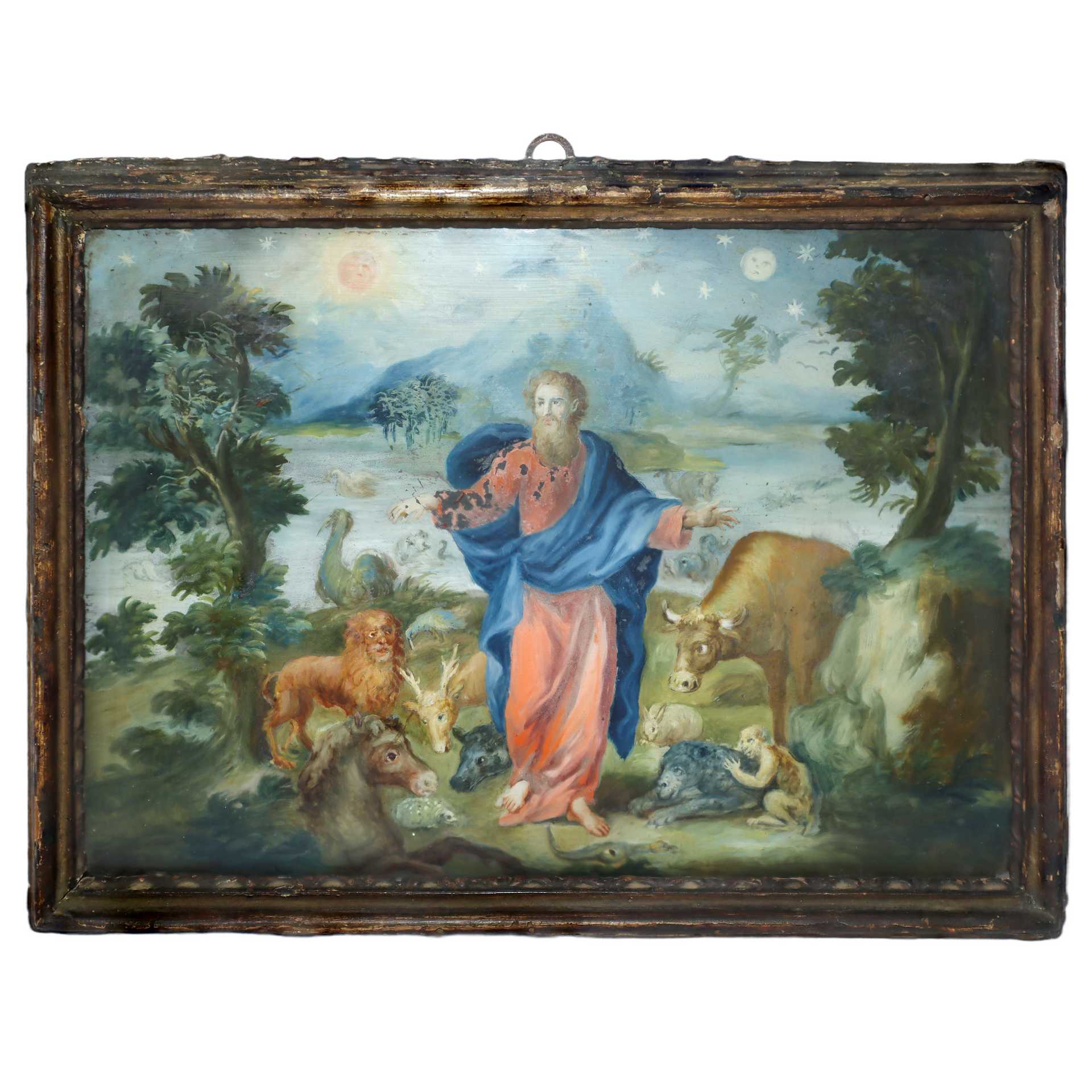 Noè e gli animali, Venice, late 18° Secolo H cm 21 x 29; (in cornice) H cm 26 x 34 Dipinto su vetro