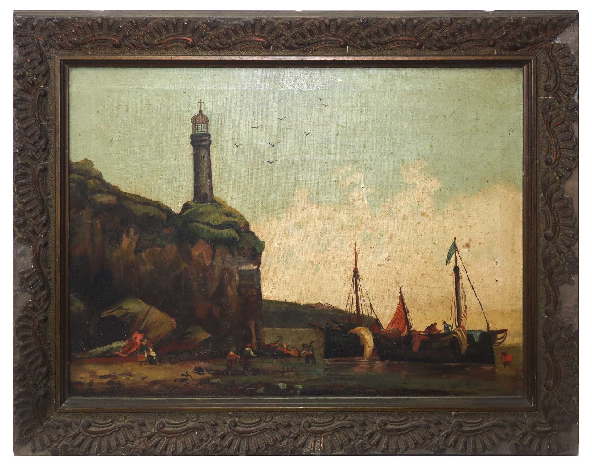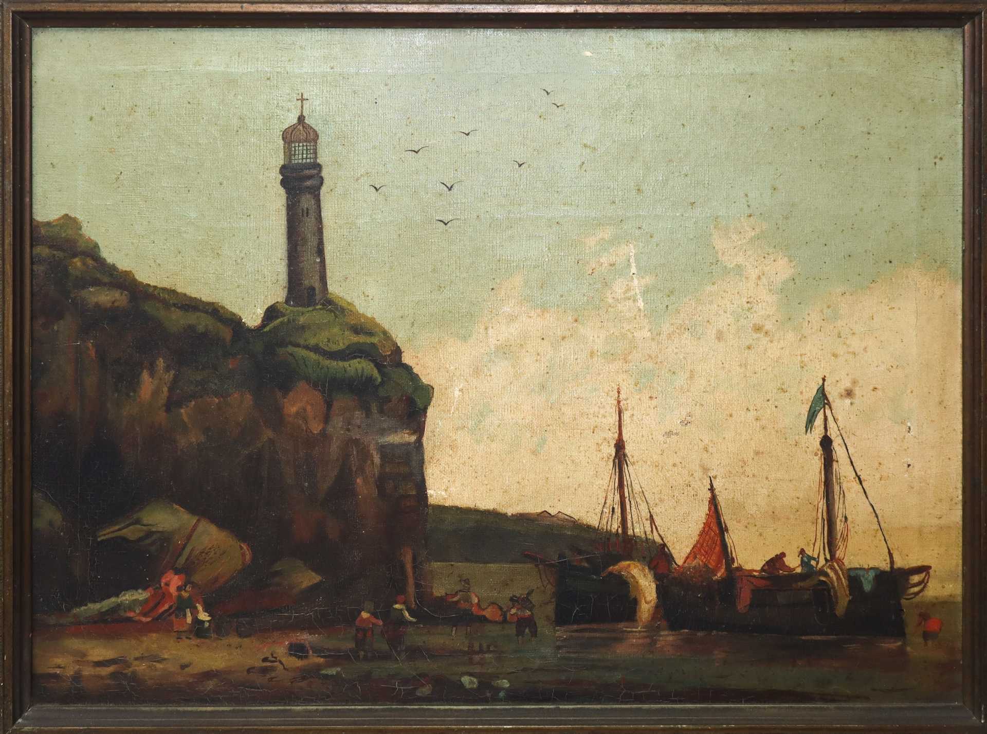 Barche con faro e personaggi, 19° Secolo cm 36x49,in cornice cm 47x60 Dipinto olio su tela P