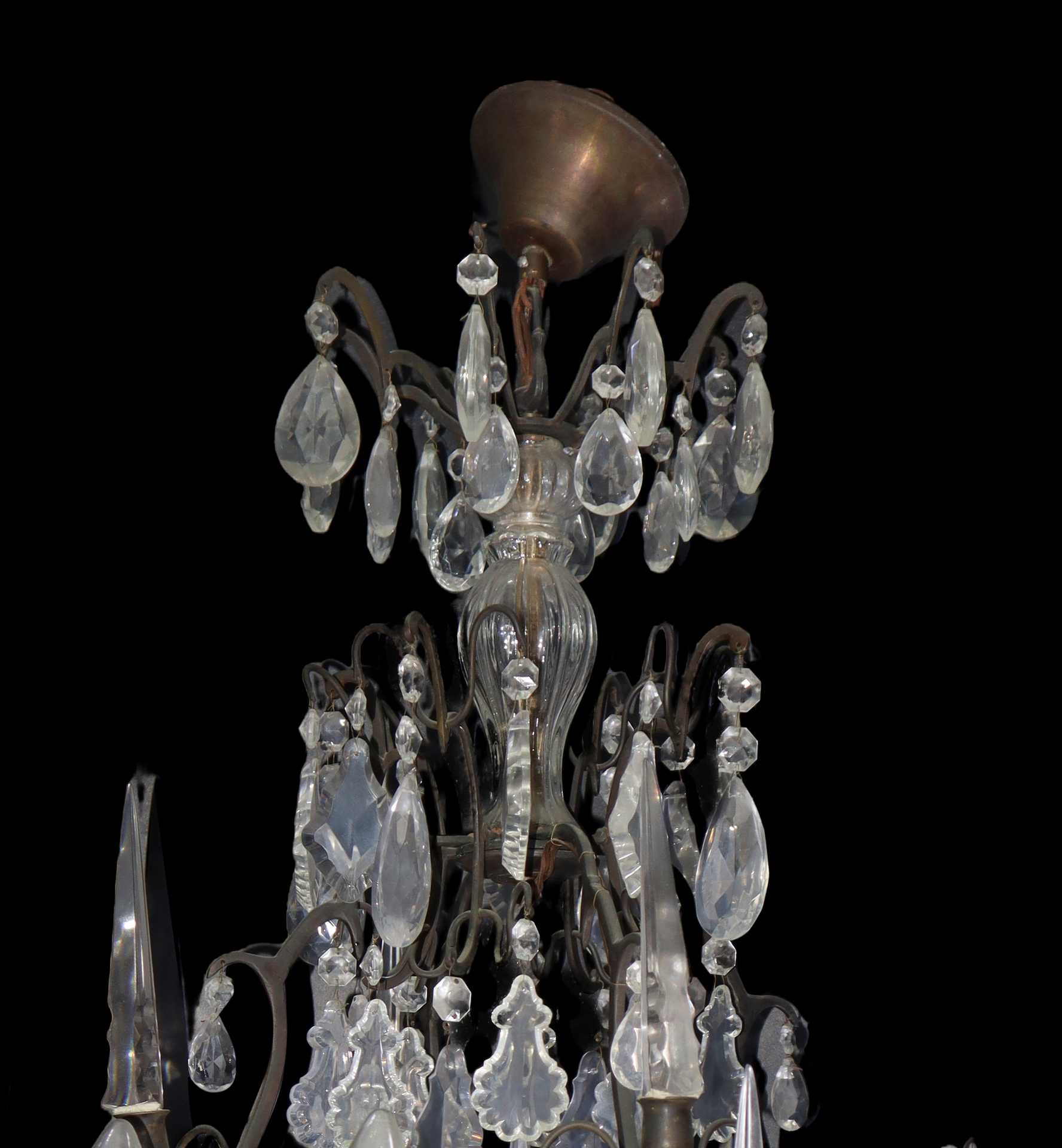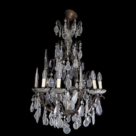 Lampadario con struttura in metallo, brindoli in vetro molati a mano, 8 luci, Early 20° Secolo H cm